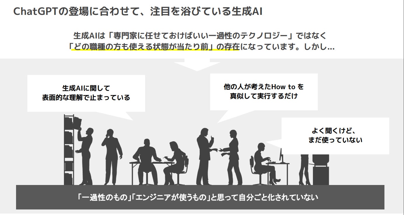 生成AI=ChatGPTというイメージをお持ちの方が多いですが、生成AIとは「Generative AI:ジェネレーティブAI」とも呼ばれ、 さまざまなコンテンツを生成できるAIのことです。従来のAIが決められた行為の自動化が目的であるのに対し、 生成AIはデータのパターンや関係を学習し、新しいコンテンツを生成することを目的としています。