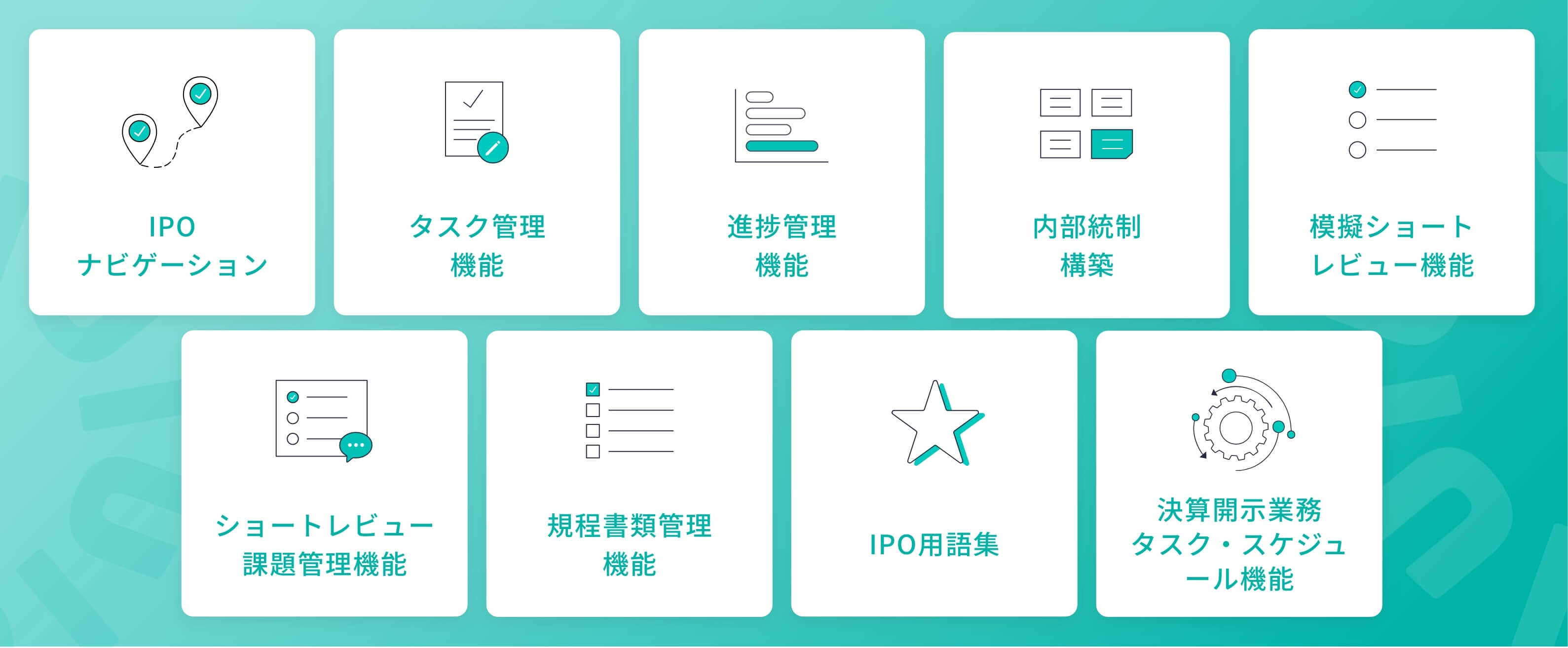 管理や変更履歴を管理する「規程書類管理機能」など、IPO準備に特化した多彩な機能を取り揃えております。