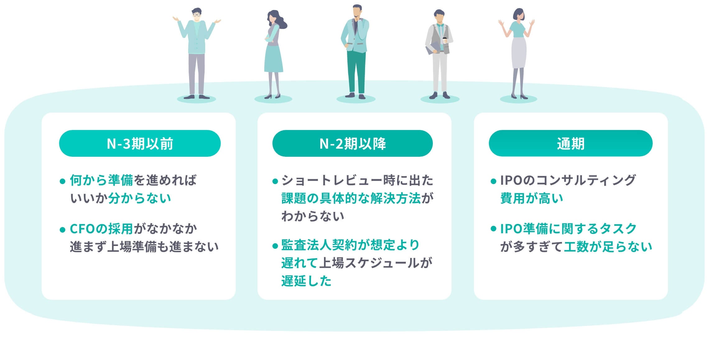 社内にIPO準備経験者が在籍していたり、CFOがすぐに見つかったというケースを除けば、心当たりのある企業様は少なくないのではないでしょうか?
