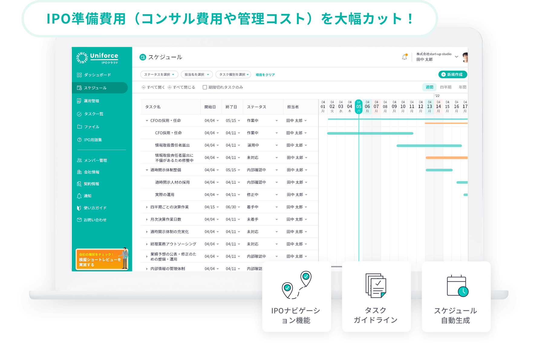 IPO準備は専門性が高く、知識や経験が求められる業務ですが、Uniforce IPOクラウドは必要なタスクやスケジュールだけでなくガイドラインや用語集が備わっており、経験者やコンサルに頼らず上場準備を進めることが可能。
