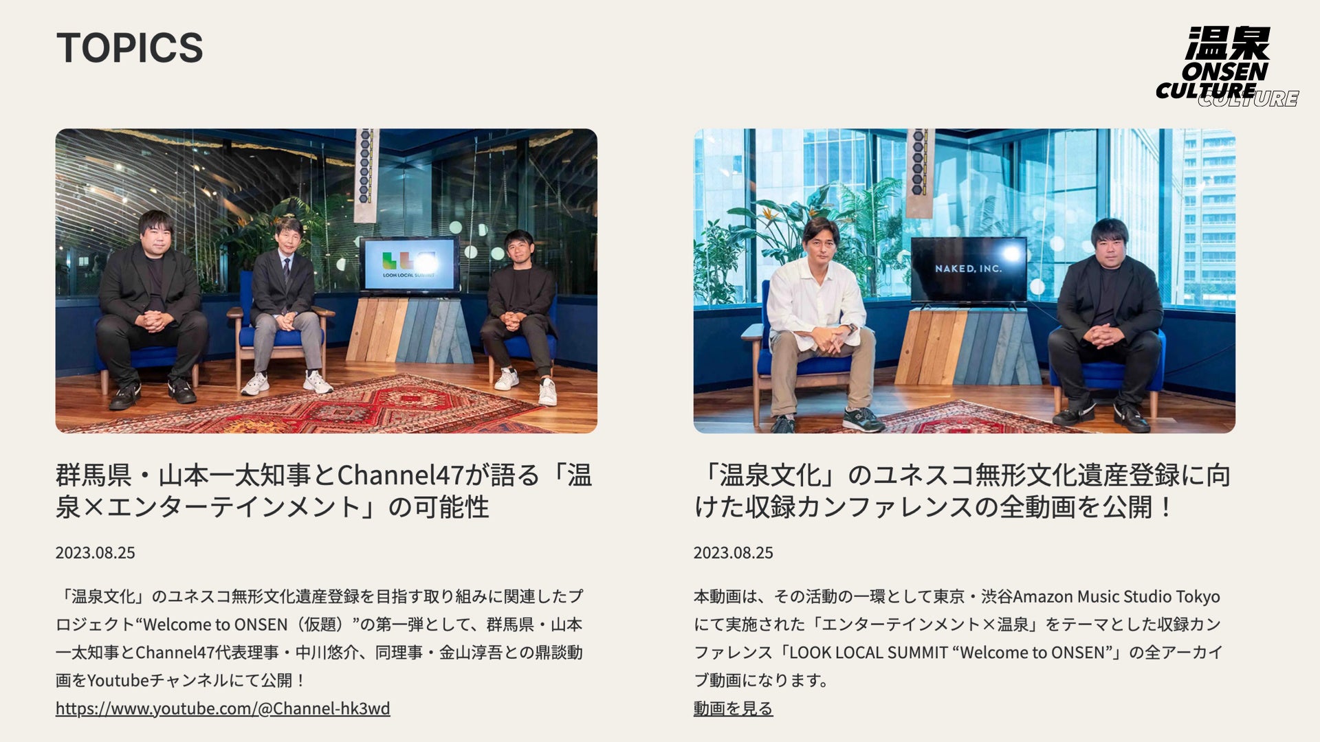 Channel47はすでに、「エンターテインメント×温泉」をテーマとした収録カンファレンスLOOK LOCAL SUMMIT “Welcome to ONSEN”を実施。その模様をYouTubeチャンネル( https://www.youtube.com/@Channel-hk3wd/ )で公開するなどしてきました。そして今回、これまでの活動を新たなプロジェクト「温泉/ONSEN CULTURE CULTURE」に統合し、公式サイトを通じて引き続き日本固有の文化である温泉文化の保護・活用・発信を推進、次代へと繋いでいくための活動に取り組んでいきます。