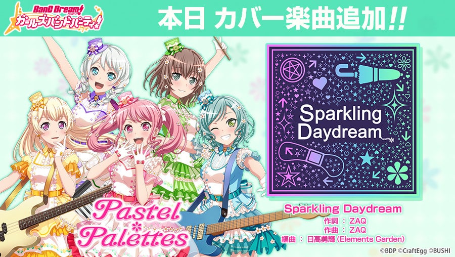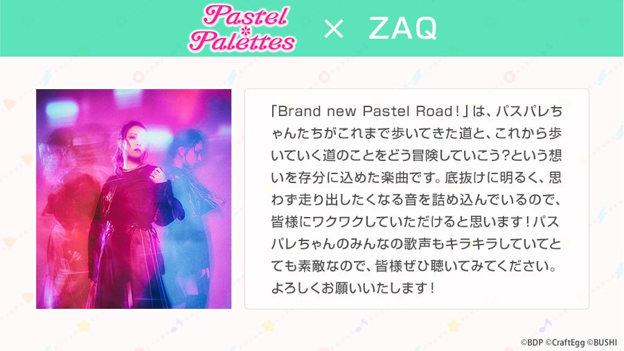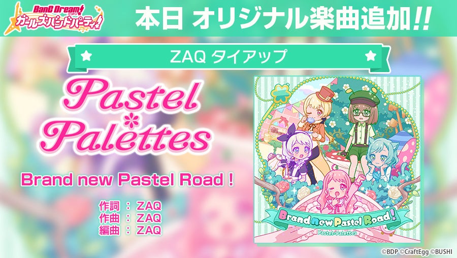 株式会社Craft Egg(本社:東京都渋谷区 代表取締役:森川 修一、以下、Craft Egg)と、株式会社ブシロード(本社:東京都中野区 代表取締役社長:橋本 義賢、以下、ブシロード)の共同制作によるスマートフォン向けゲーム「バンドリ! ガールズバンドパーティ!」(以下、ガルパ)は、2022年3月18日(金)より、アーティストタイアップ第4弾として「Pastel*Palettes×ZAQ」を実施し、ZAQさんからPastel*Palettesへの提供楽曲『Brand new Pastel Road!』をゲーム内に追加いたしました。