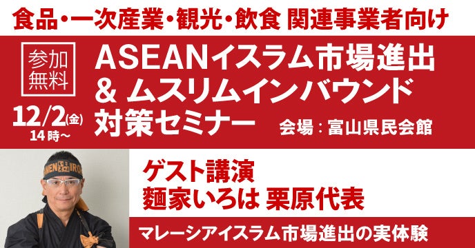 日本企業のイスラム市場進出支援メディア「Salam Groovy Japan」では、2022年12月2日(金)、富山県内の企業・団体様を対象に、イスラム市場進出とムスリムインバウンド対策をテーマにしたセミナーを開催します。