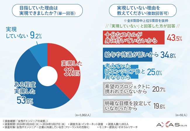 『実現した(37.8%)』『ある程度実現した(53.0%)』と答えた方が9割を超える結果となりました。「Q:ITエンジニアを目指した理由を教えてください」の回答とあわせて考察すると、多くの方がITエンジニアという職業の安定性・成長性を実感していると見受けられます。