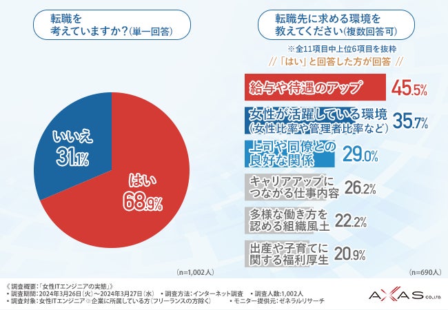 【1,002名にアンケート調査/女性ITエンジニアの実態】性別を問わず働きやすい環境であるにも関わらず、約7割が転職を検討