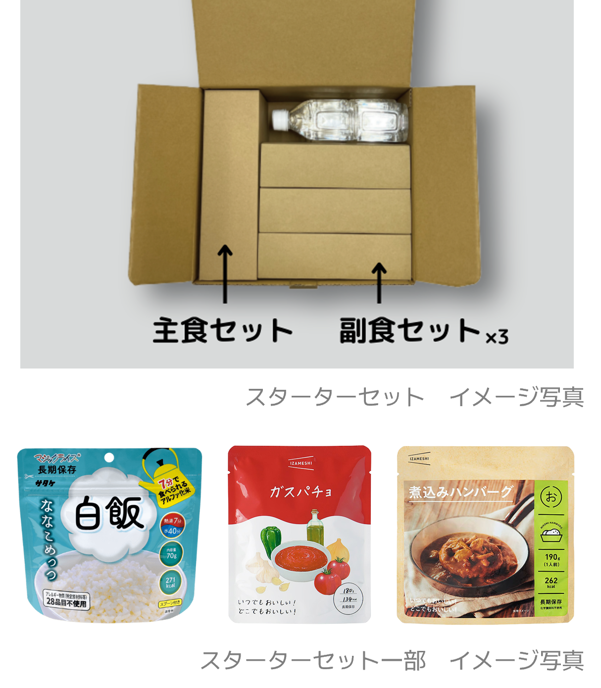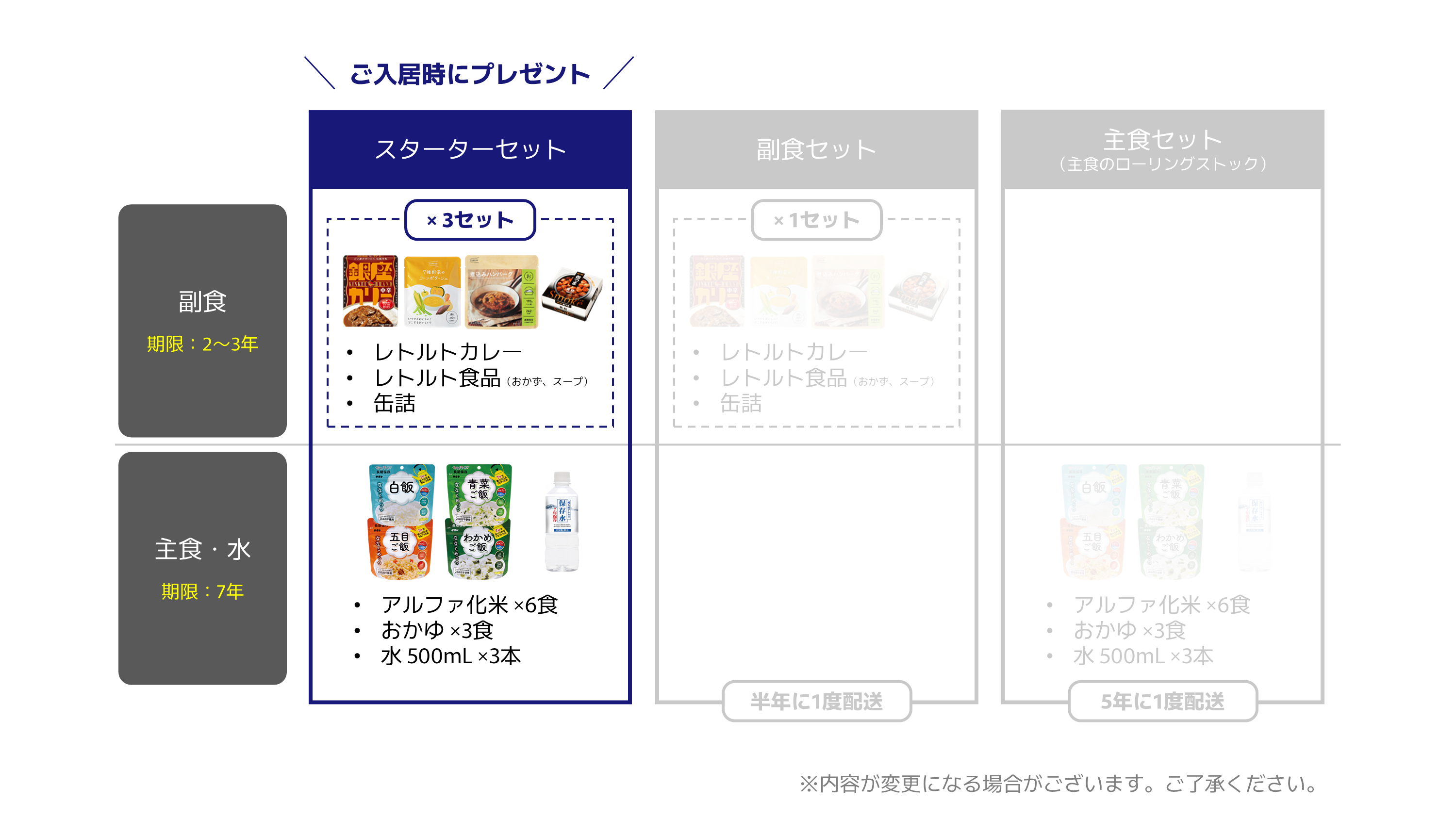 3日分の食料(主食・副食)と水がセットになったスターターセットを、マンションお引き渡し時にお渡しします。 3日分の食事が備えられるので、もしもの時も安心です。