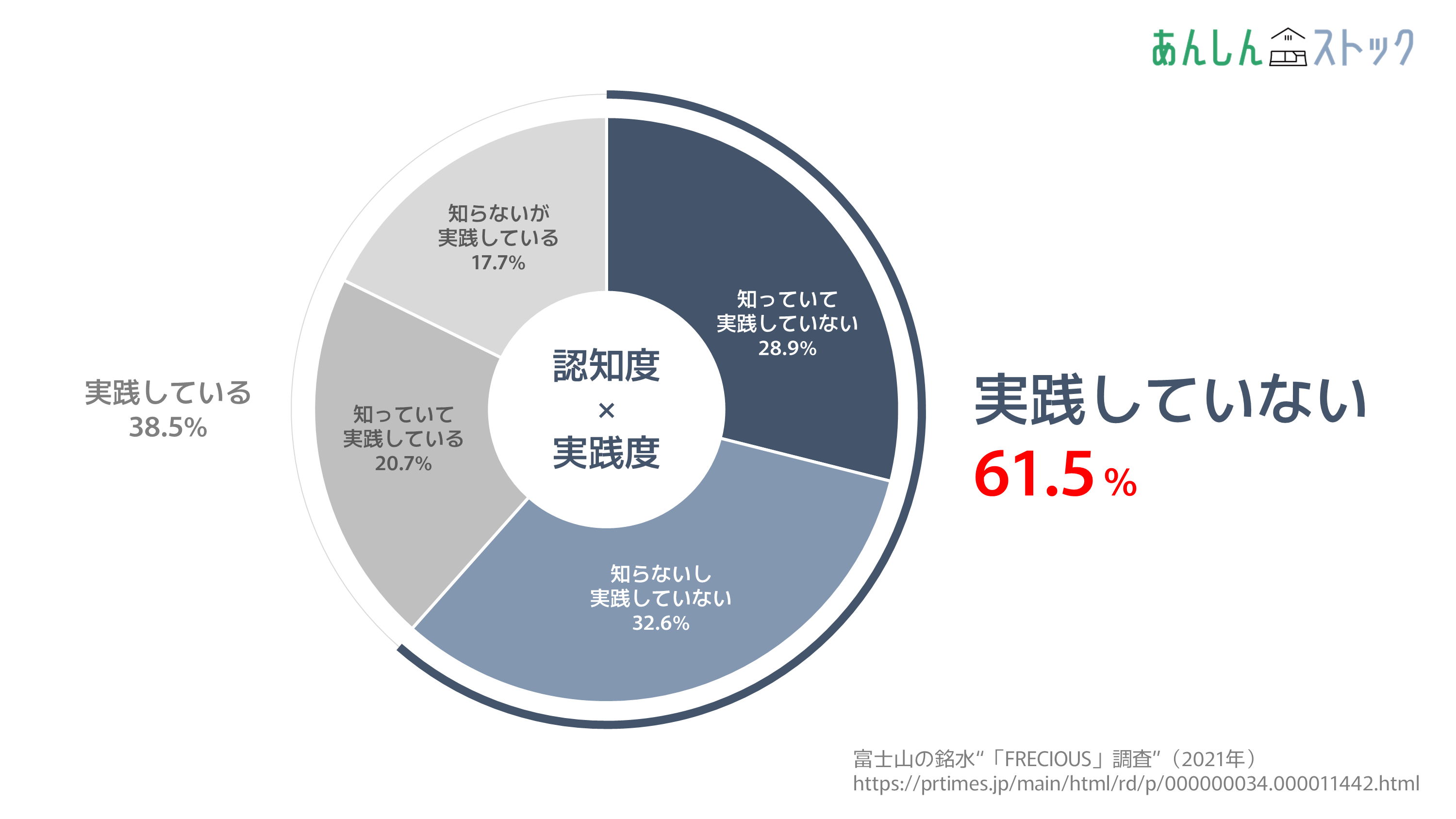 近年の災害増加によって防災意識が向上し、ローリングストックの認知度は向上しているものの、その実践度は約4割に留まり、6割の方は実践していません(2021年度調べ)。また、「賞味期限を意識して計画的に消費しないといけない」「賞味期限が古いものを取り出して管理するのが面倒」といったお悩みの解消や、実践度を上げていくことも課題となっています。