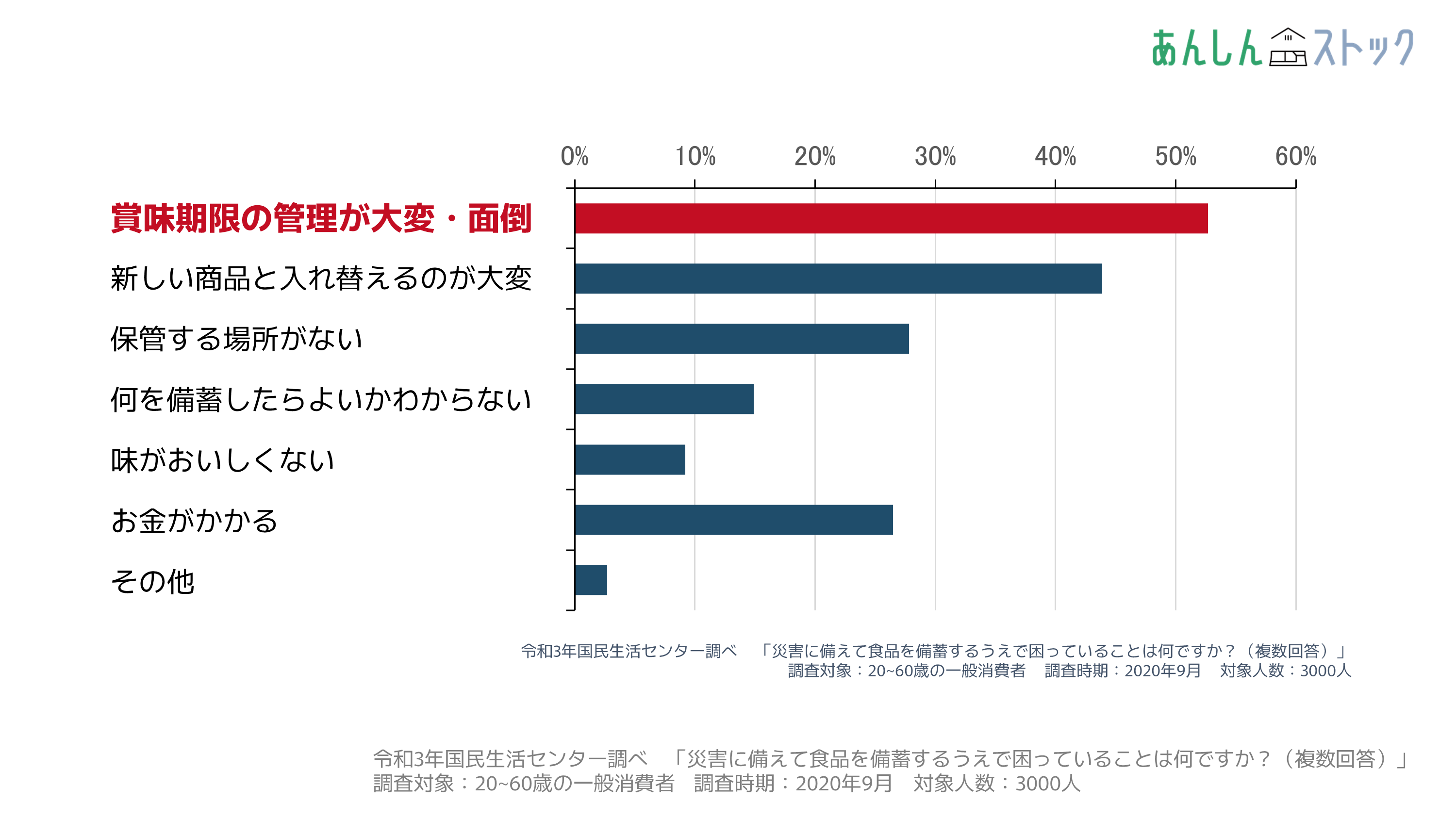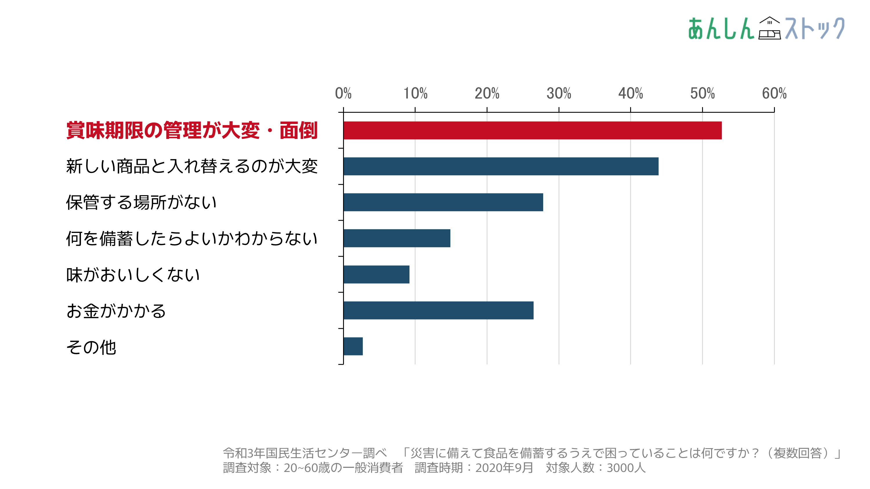 このような状況に備えるためにも欠かせないのが備蓄です。備蓄は、最低でも3日分の食料と水を準備することが求められています。しかし、多くの方が賞味期限の管理が大変・面倒と感じているのが現状です。