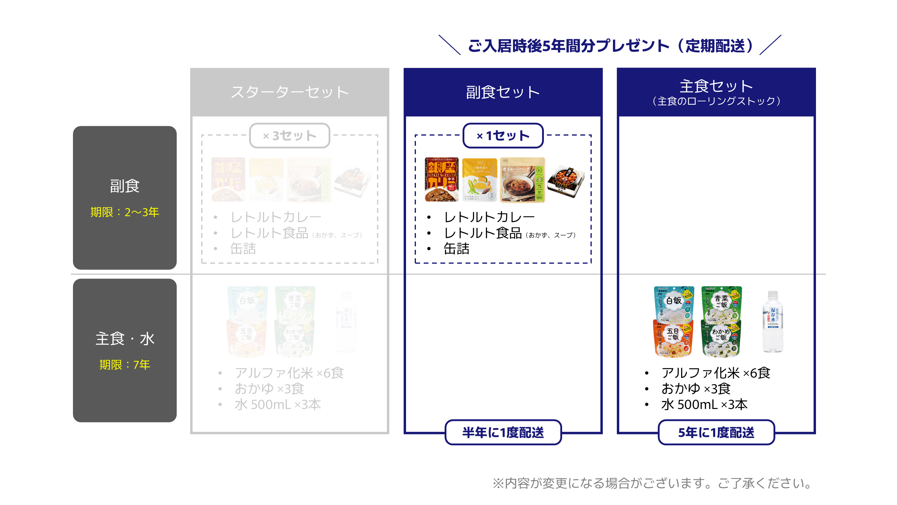 レトルトカレーなどが入った副食セットは半年に一度、アルファ化米などの長期保存の主食セットは5年に一度、ご自宅に届きます。