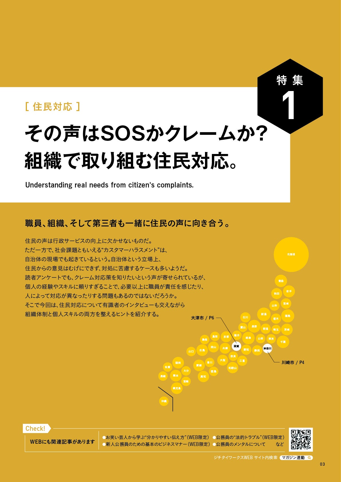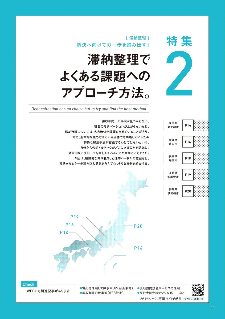 今号の特集1では、「[住民対応]その声はSOSかクレームか?組織で取り組む住民対応。」をテーマに、神奈川県川崎市、滋賀県大津市の取り組みをご紹介しております。特集2では、「[滞納整理]滞納整理でよくある課題へのアプローチ方法。」をテーマに、東京都東大和市、愛知県豊田市、兵庫県加西市、長野県安曇野市の取り組みをご紹介しております。