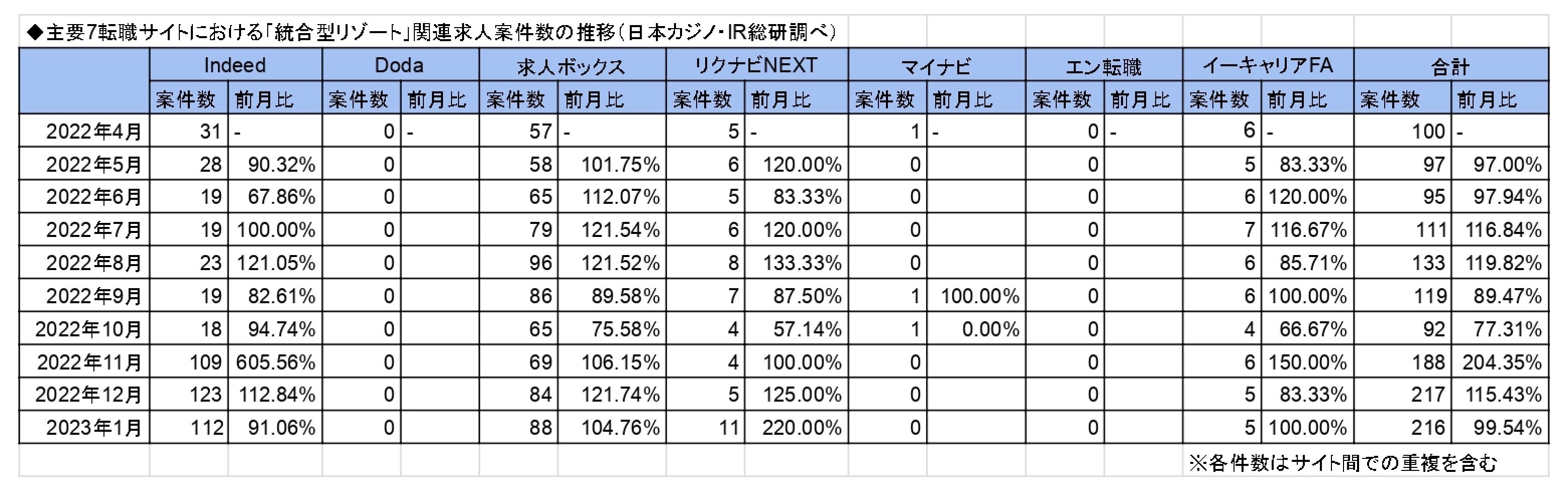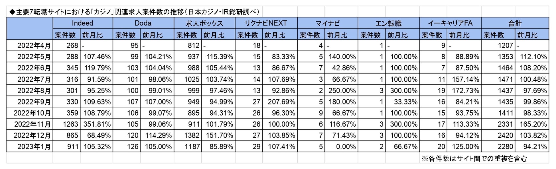 カジノIR業界専門ニュースメディア「日本カジノ・IR総研」は、主要となる7つの転職サイトにおける2023年1月12日時点の「カジノ」と「統合型リゾート」に関連する求人案件数をそれぞれまとめました。