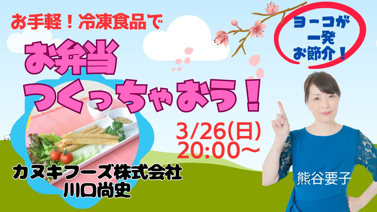 「カヌキフーズ」さんの手軽で美味しく!お弁当にも使える冷凍食品を使って今日から使えるお弁当レシピを公開します。今回のライブでは、カヌキフーズさんの大人気商品「パリパリビアッソ」をつかってヨーコがお弁当作っちゃいます。