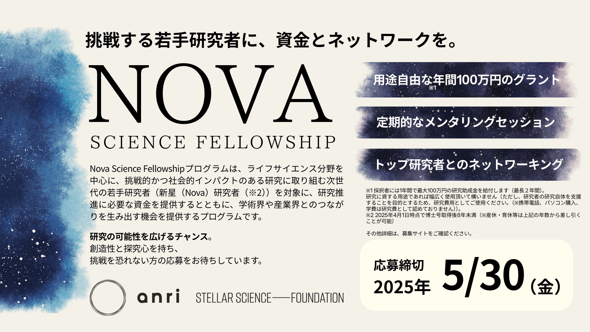 2025年4月、スタートアップ投資を通じて社会変革を支えるベンチャーキャピタル ANRI 株式会社(東京都港区:代表パートナー 佐俣アンリ、以下 「ANRI」)と、分野を超えた研究交流を通じて、新しい発見や発明が生まれるエコシステムの構築を目指す一般社団法人STELLAR SCIENCE FOUNDATION(ステラ・サイエンス・ファウンデーション、所在地:東京都中央区、代表理事:武部貴則、以下「SS-F」) は、共同で次世代の若手研究者の育成とネットワーク形成を支援する新たなグラント(研究助成金)プログラム 「Nova Science Fellowship」 を立ち上げます。