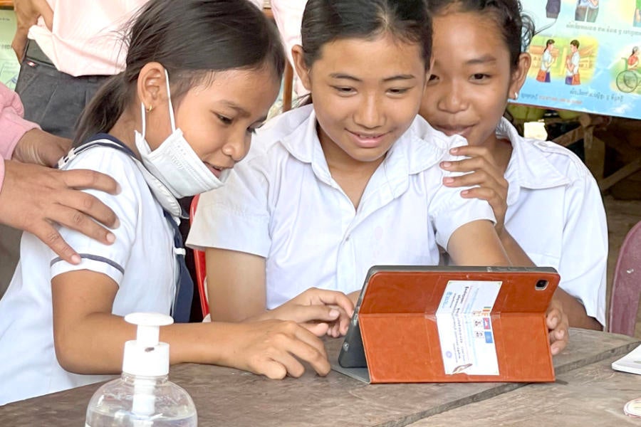 現地の行政や日本の専門家の協力を得ながら新しい教材を開発しています。また、タブレットの整備等も進め、自ら情報を得る力を育てています。