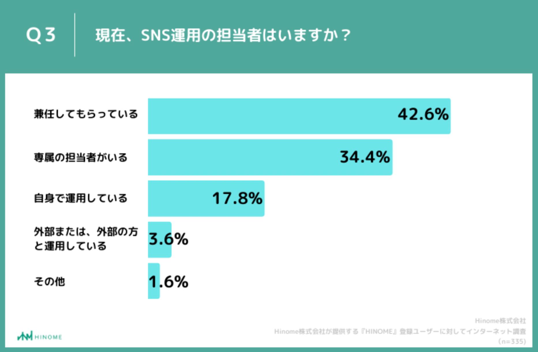 「Q3.今、SNS運用の担当者はいますか?」(n=335)と質問したところ、「専属の担当者がいる」が34.4%、「兼任してもらっている」が42.6%という回答になった。