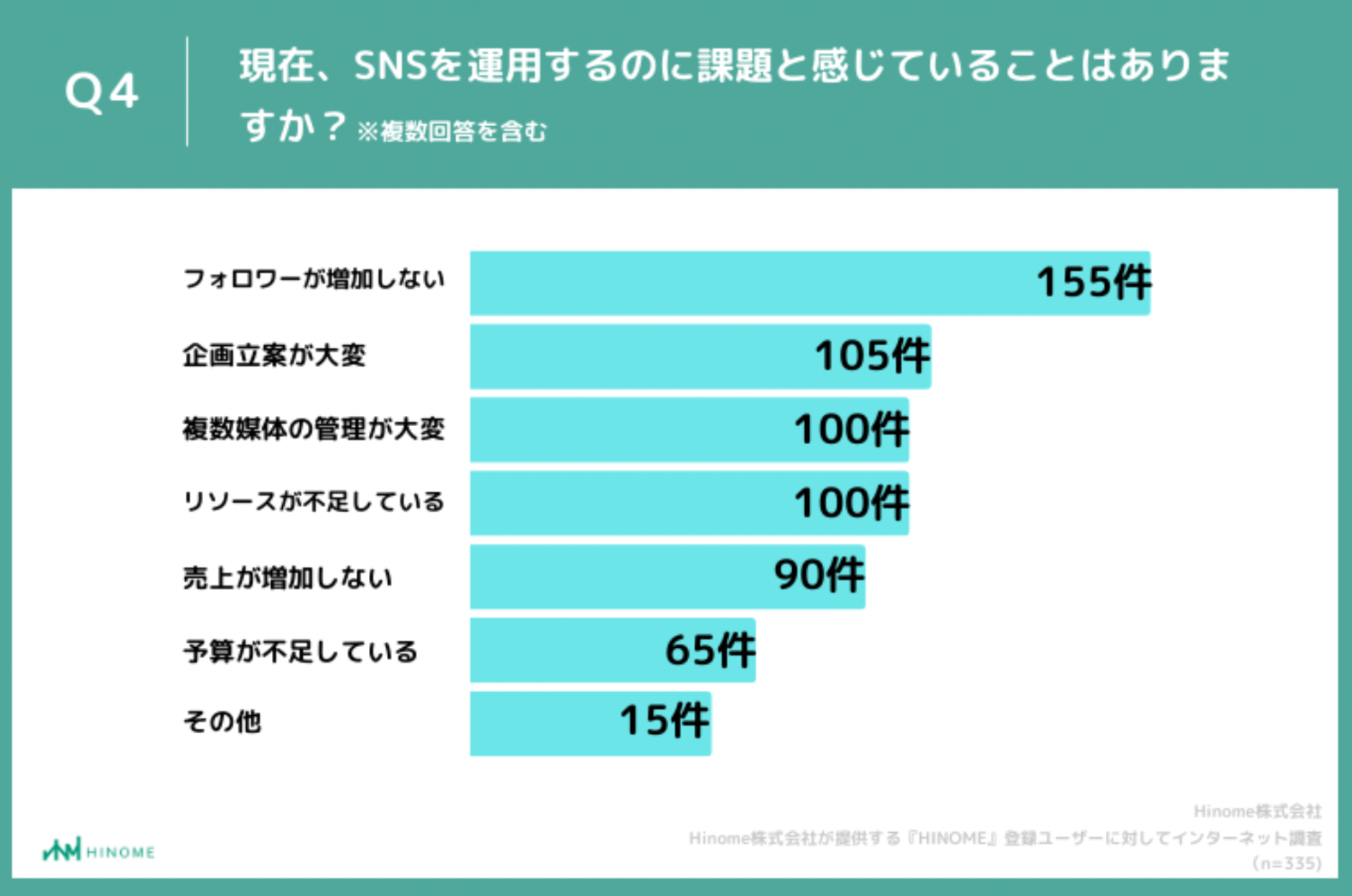 次に「Q4.現在、SNSを運用するのに課題と感じていることはありますか?」(n=335)と質問したところ、「フォロワーが増加しない」が50.8%、「リソースが不足している」が32.8%、「売上が増加しない」が29.5%という結果になった。