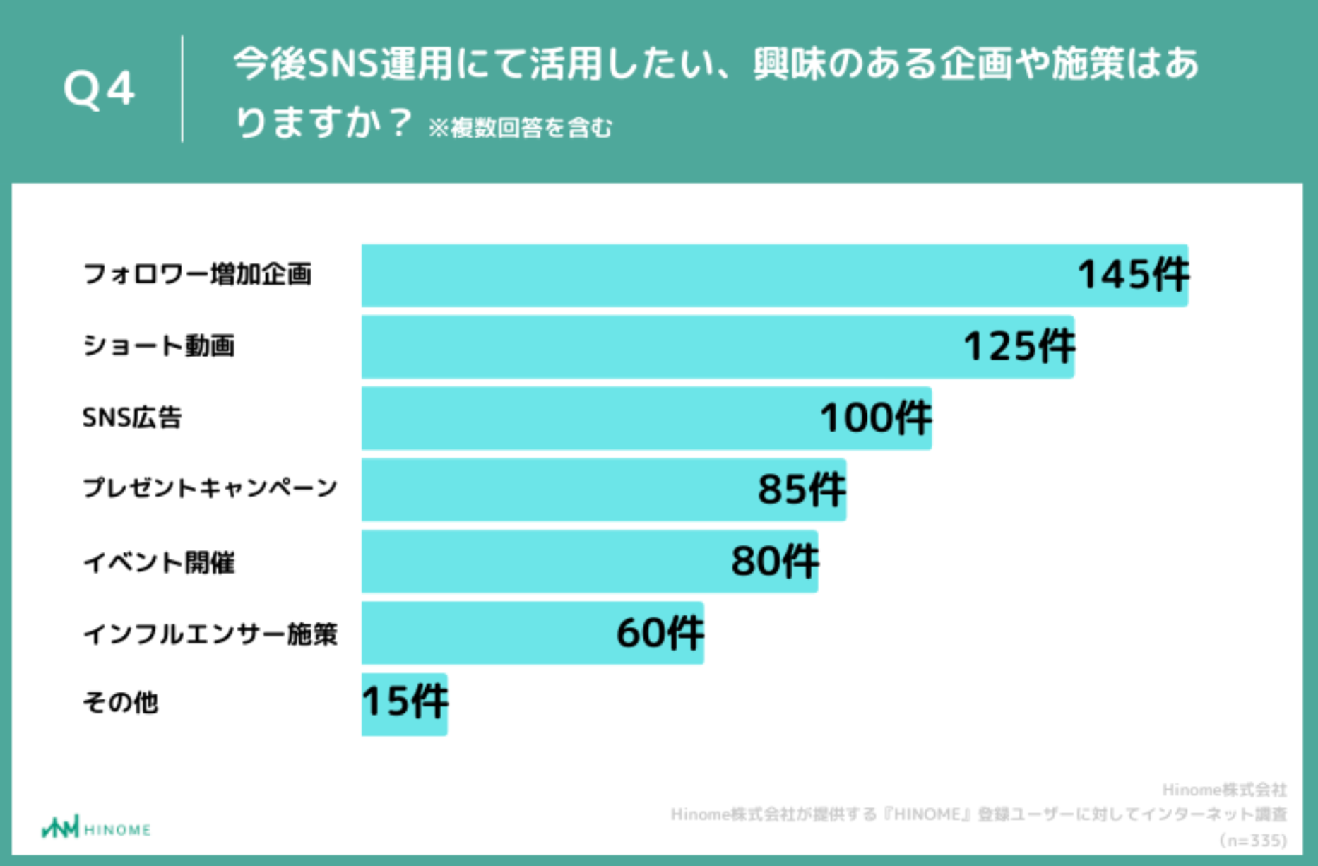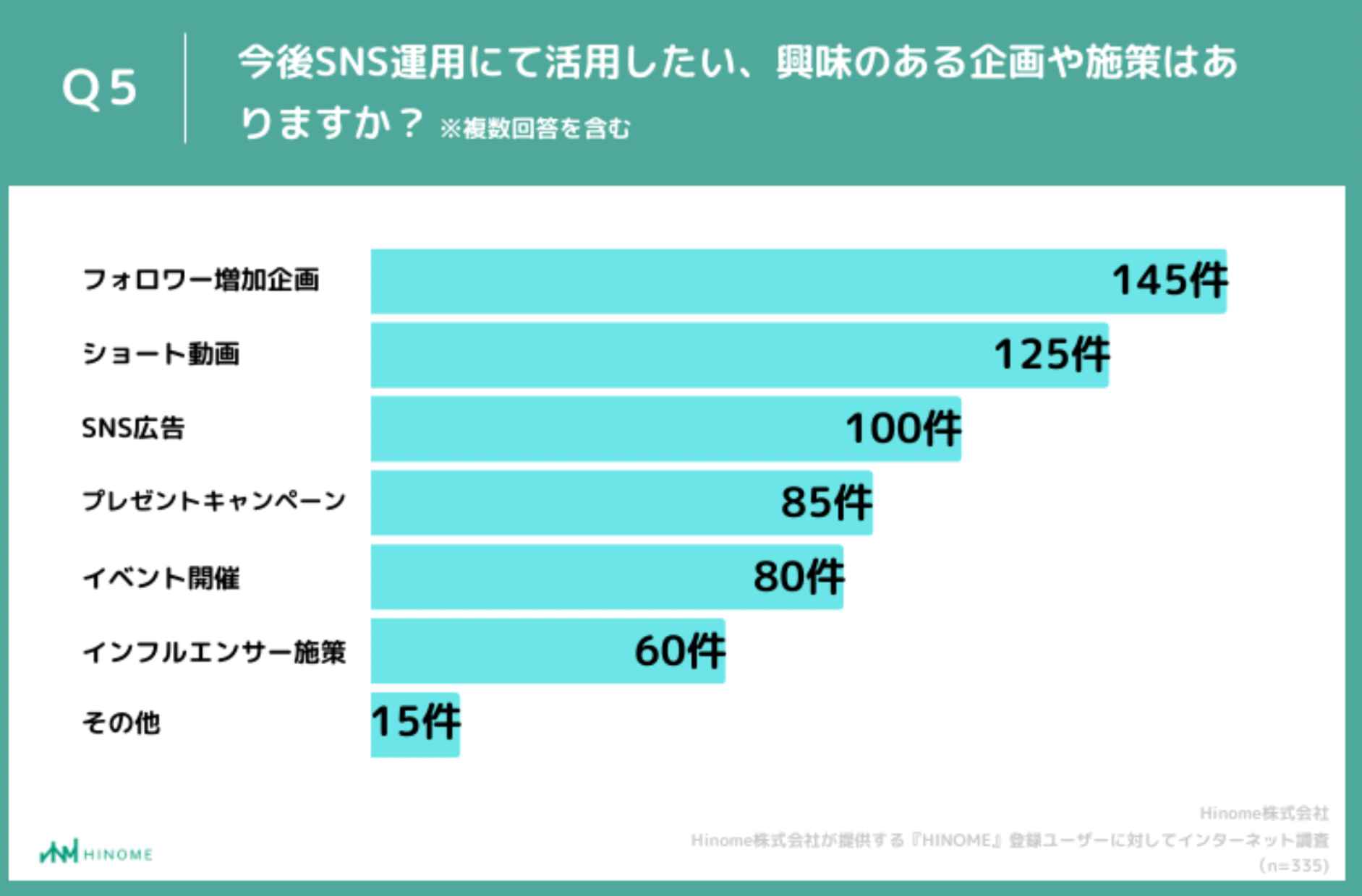「Q5.今後SNS運用にて活用したい、興味のある企画や施策はありますか?(複数回答)」(n=335)と質問したところ、「フォロワー増加企画」が47.5%、「ショート動画」が41.0%、「SNS広告」が32.8%という回答に。