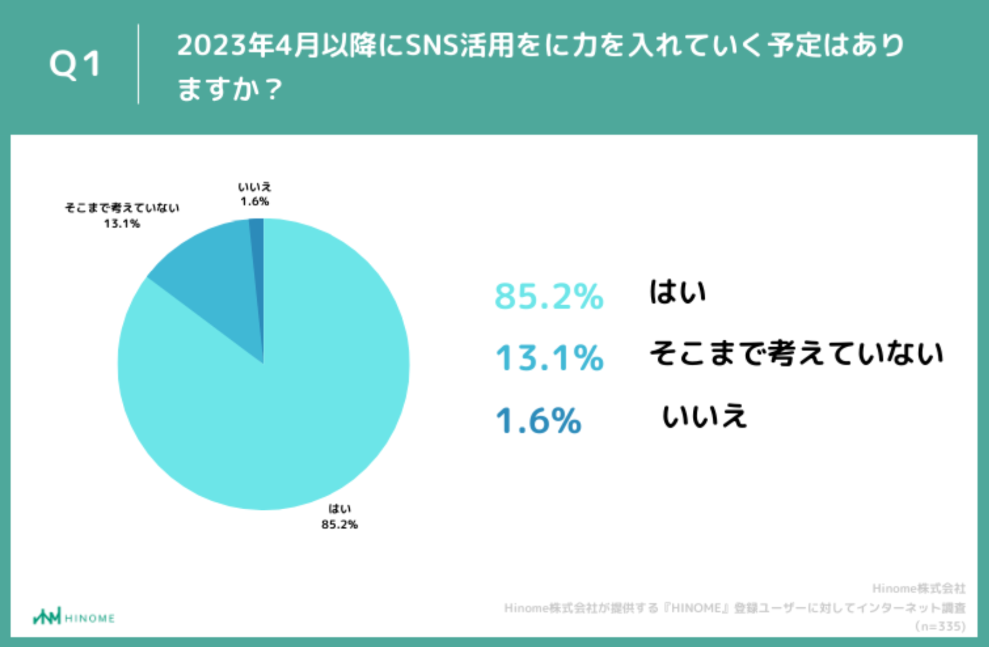 「Q1.2023年4月以降にSNS活用をに力を入れていく予定はありますか?」(n=335)と質問したところ、「力を入れていく予定」が85.2%、「いいえ」が13.1%という回答になった。