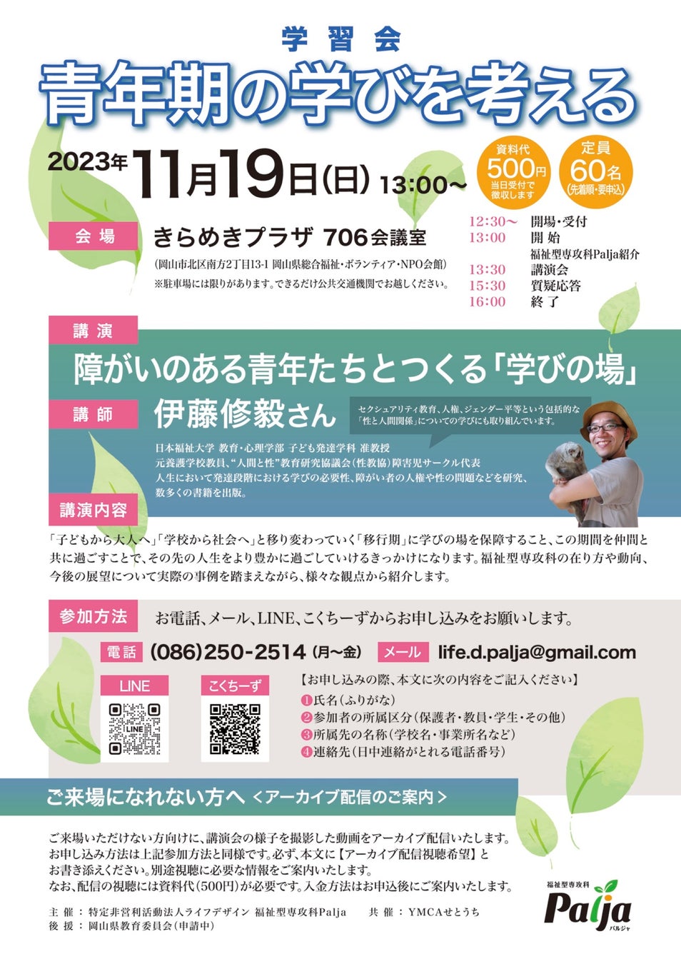 福祉型専攻科Palja*YMCAせとうち合同企画 オンライン&リアル講演 学習会 講演:障がいのある青年たちとつくる「学びの場」