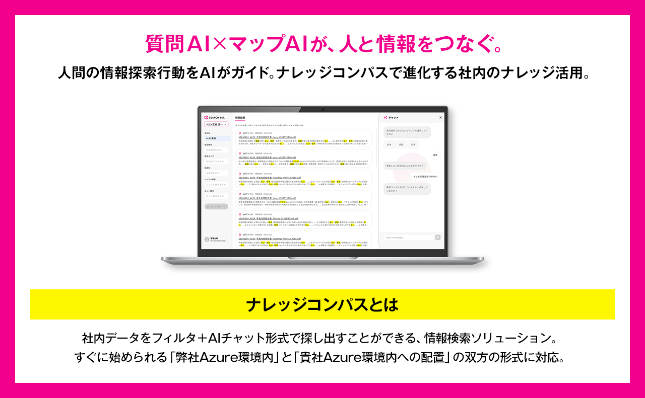 こうした背景を受け、私たちは「人と情報の距離をゼロにする」というビジョンのもと、誰でも簡単に目的のデータを探すことができる社内ナレッジハブ「ナレッジコンパス」を開発いたしました。