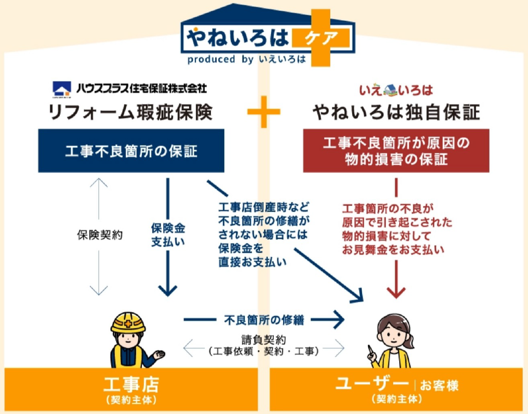「やねいろはケア」は、国土交通大臣指定の住宅専門保険会社(ハウスプラス住宅保証株式会社)が提供する「リフォーム瑕疵保険」と当社が提供する「やねいろは独自保証」をセットにした有料保証サービスです。