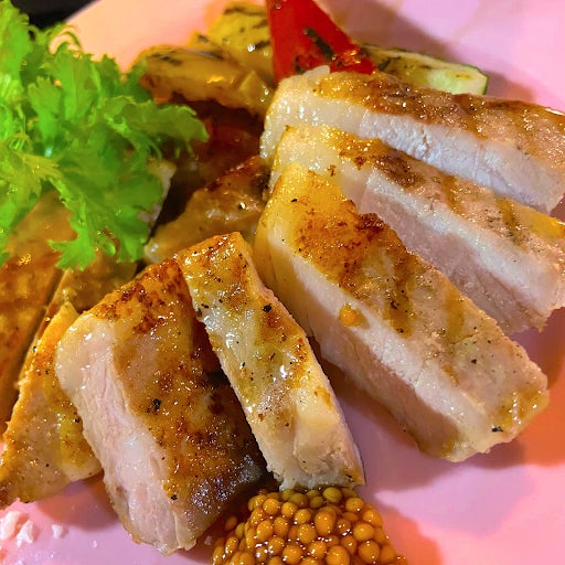 弾力・保水性がともに良く歯触りの良い肉質の松坂ポーク。肉の持つ独自の旨味と脂肪の甘さ、そしてまろやかな味わいが特徴です。付け合わせの食べる粒マスタードとの相性も抜群。