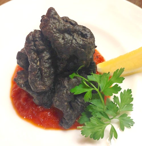 ヤリイカにイカ墨の衣をまとわせてサクッと揚げました。衣にイカ墨を混ぜることにより、風味とコクが増します。