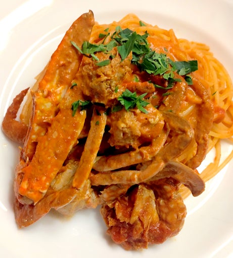 ワタリガニをなんと1杯丸ごと使用。カニのエキスをしっかりと感じることができる、味わい深く贅沢なパスタです。