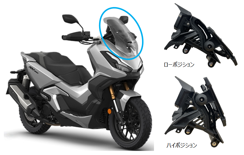このたび量産を開始したスクリーンアジャスターは、中型二輪車向けにさらに改良した製品で、従来通りの操作性や組付け性を踏襲しつつ、2段階から4段階へと調整幅を拡げ快適性を向上したものです。この新型スクリーンアジャスターは、HondaのADV350に搭載されています。
