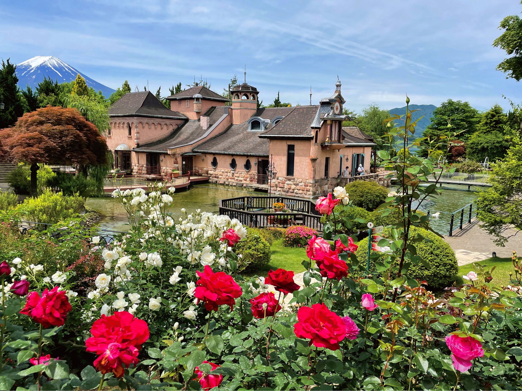 庭園ではフランスの国旗の色に合わせたお花を各所に展開。お花とフォトジェニックな空間が楽しめます。6月には1200株720品種のバラが咲き誇り館内を彩ります。