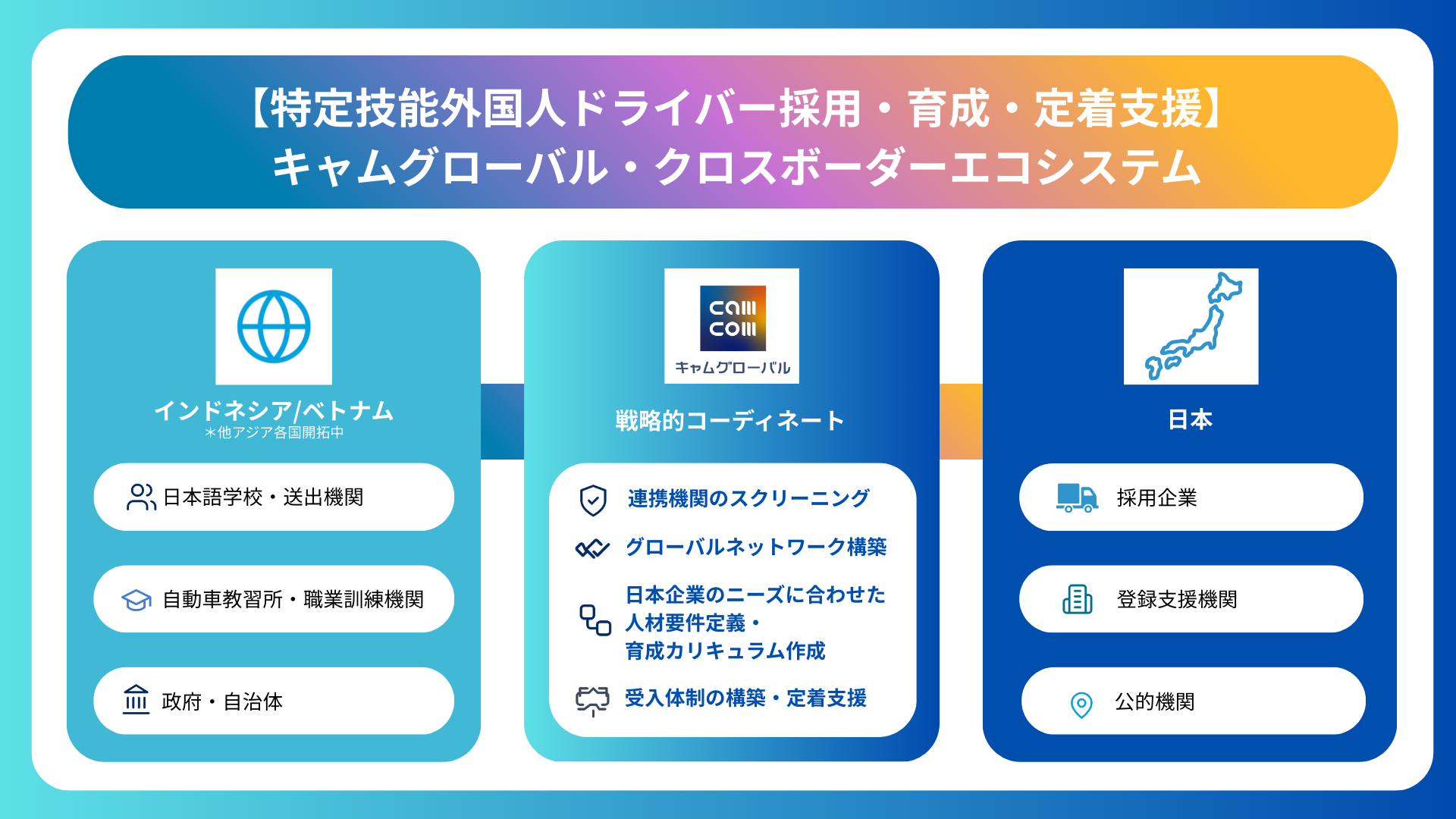 キャムグローバルは、この「現地採用・育成・定着」の一気通貫モデルを、これからの日本における外国人ドライバー雇用の新たな「品質基準(スタンダード)」とし、持続可能な物流インフラの維持に貢献してまいります。