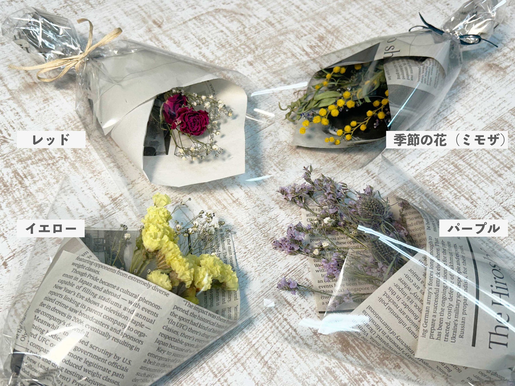 種類は定番3色の「イエロー」「レッド」「パープル」と、「季節の花」の4種からお選びいただけます。ご家族や日頃お世話になっている方へのちょっとしたプレゼントにどうぞ。