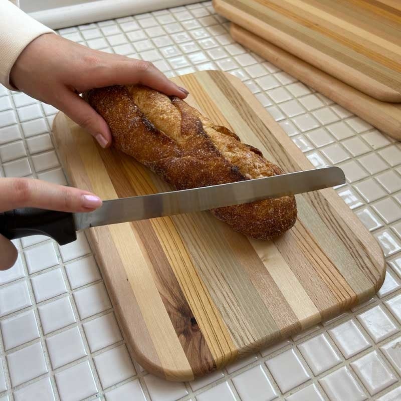 ケヤキやホオの一枚板のカッティングボードや、8種類の広葉樹をつなぎ合わせたストライプ柄のカッティングボードをラインナップ。