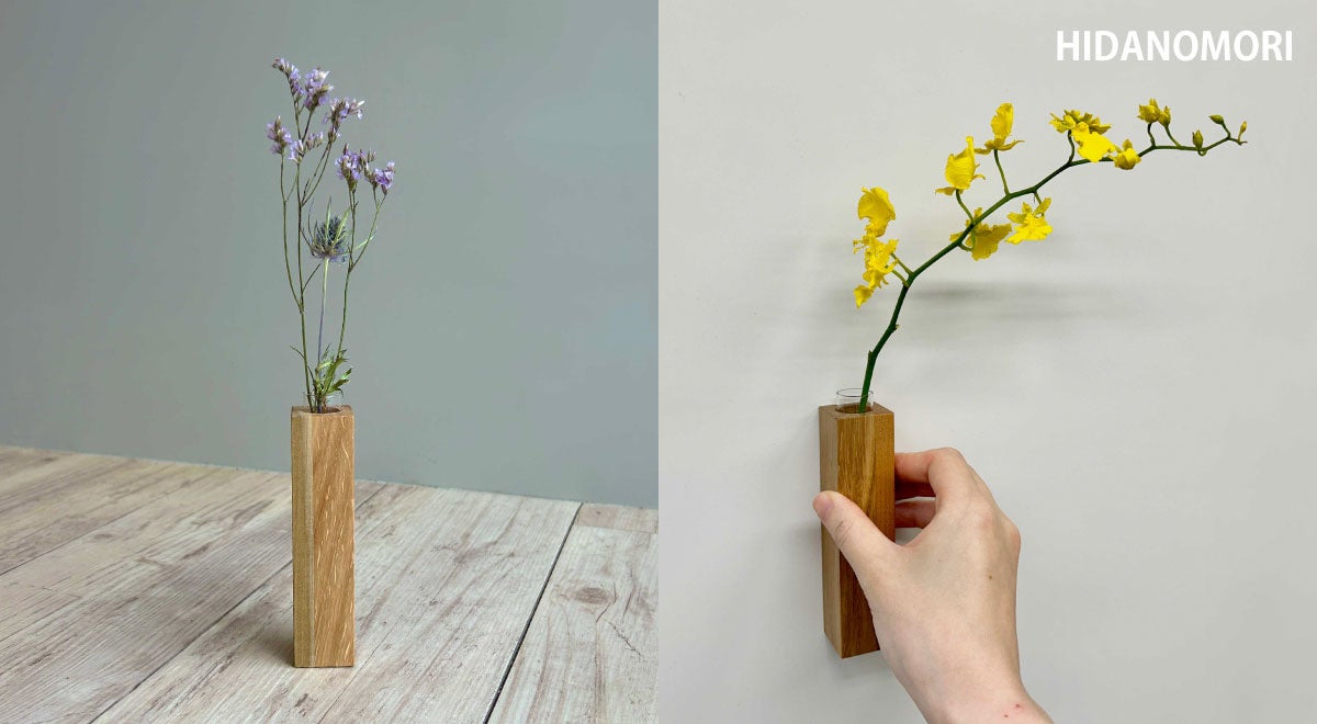 2023年12月に発売した、土台部分がキューブ型の一輪挿し「ひだの森 小さな木の一輪挿し『MOKURIN』」に続く、木製一輪挿しの第二弾となる商品です。