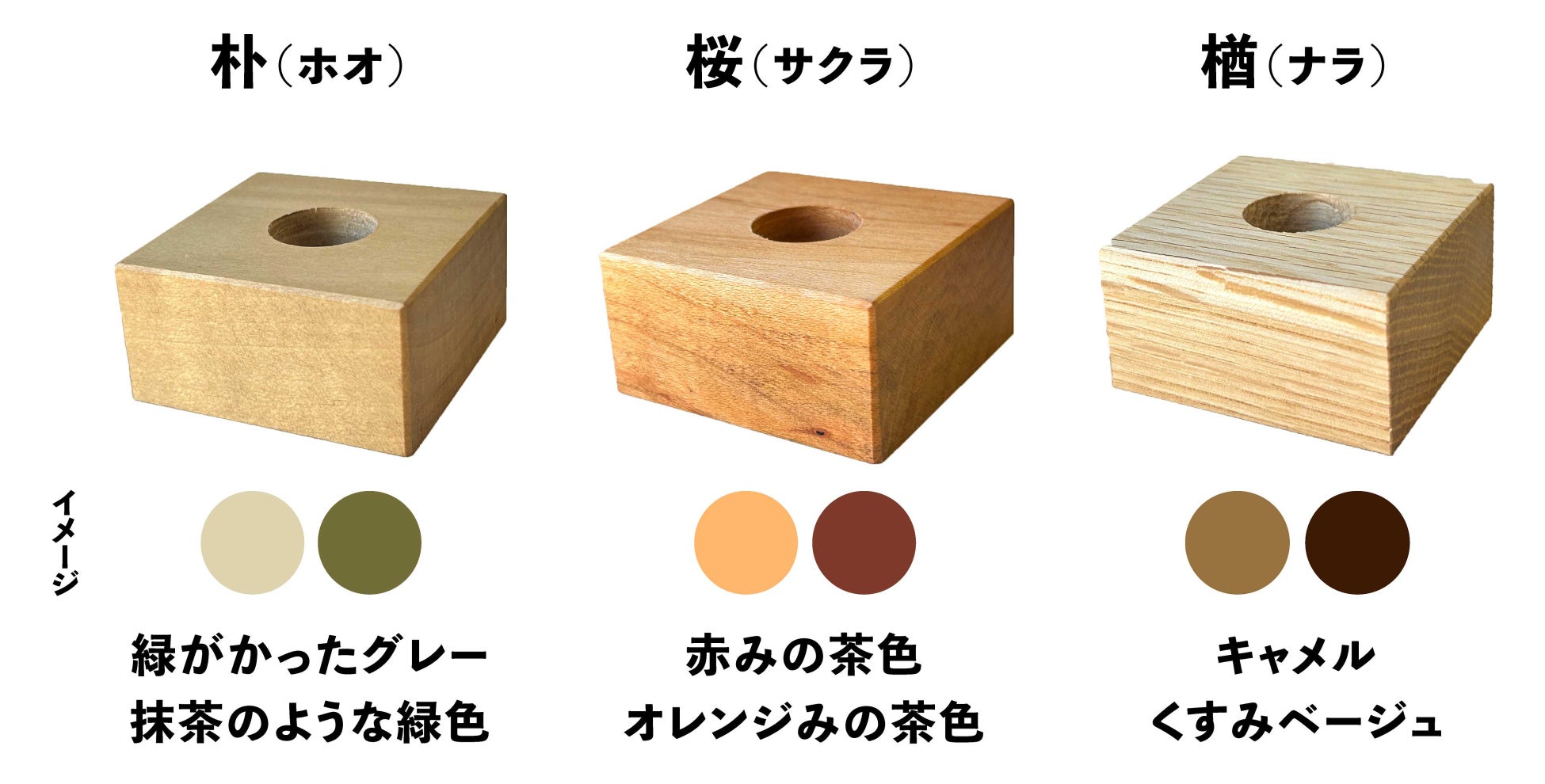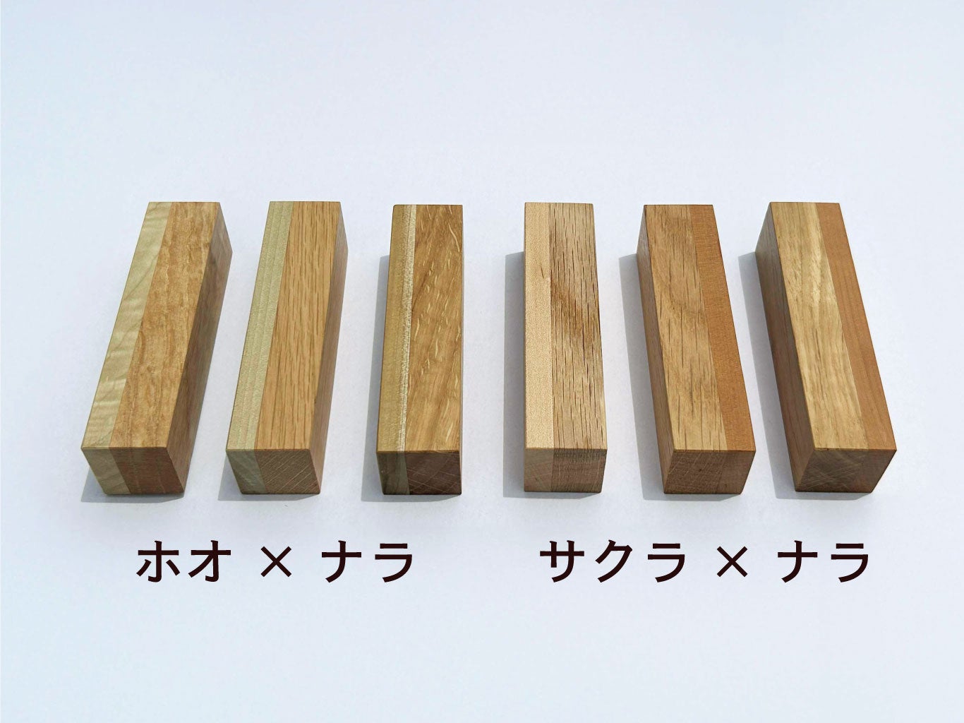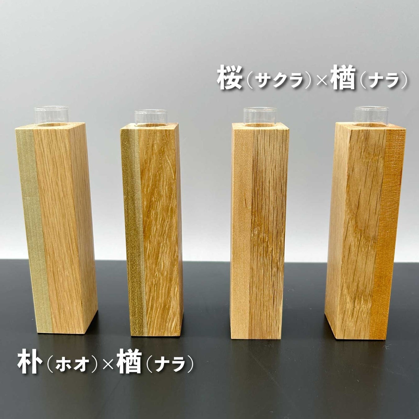 商品ラインナップは、「ホオ×ナラ」「サクラ×ナラ」の2種の組み合せとなります。樹種や個体によって木目や色味が異なる、世界に一つだけの一輪挿しです。