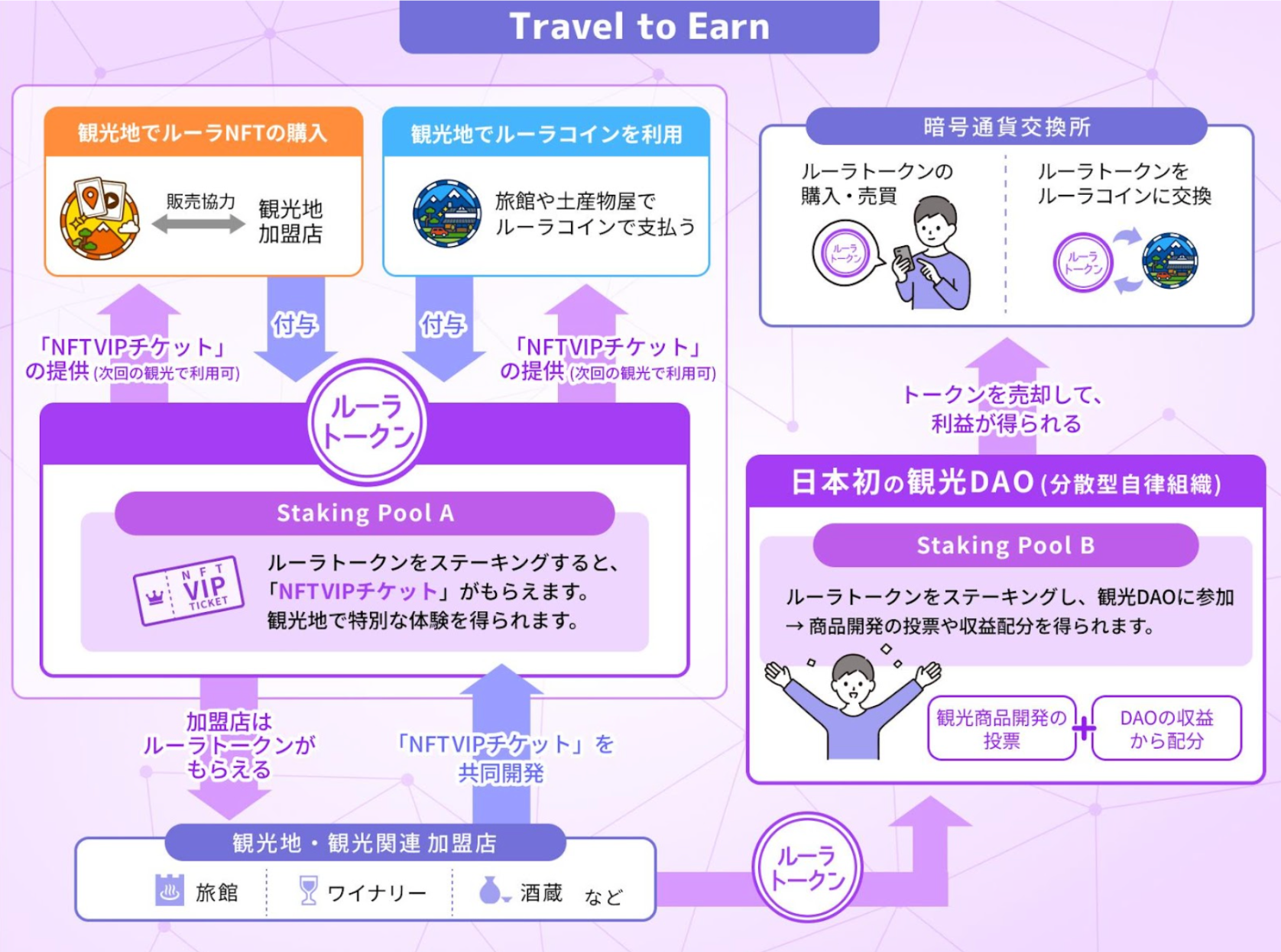 ルーラトークンとは、国内旅行者、インバウンド旅行者の増加を目指し、国内観光を促進する「Travel to Earn」をコンセプトにした暗号資産になります。トークンを所有することで、全国の観光地で使える「VIPチケット」が付与され、そのチケットを使って、観光地で特別な体験ができたり、限定の宿泊プランやツアーに参加できたりと、観光地支援に繋がる様々な体験を得ることができます。