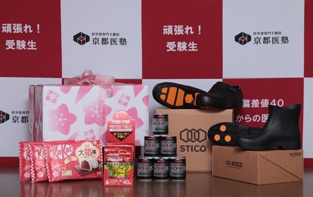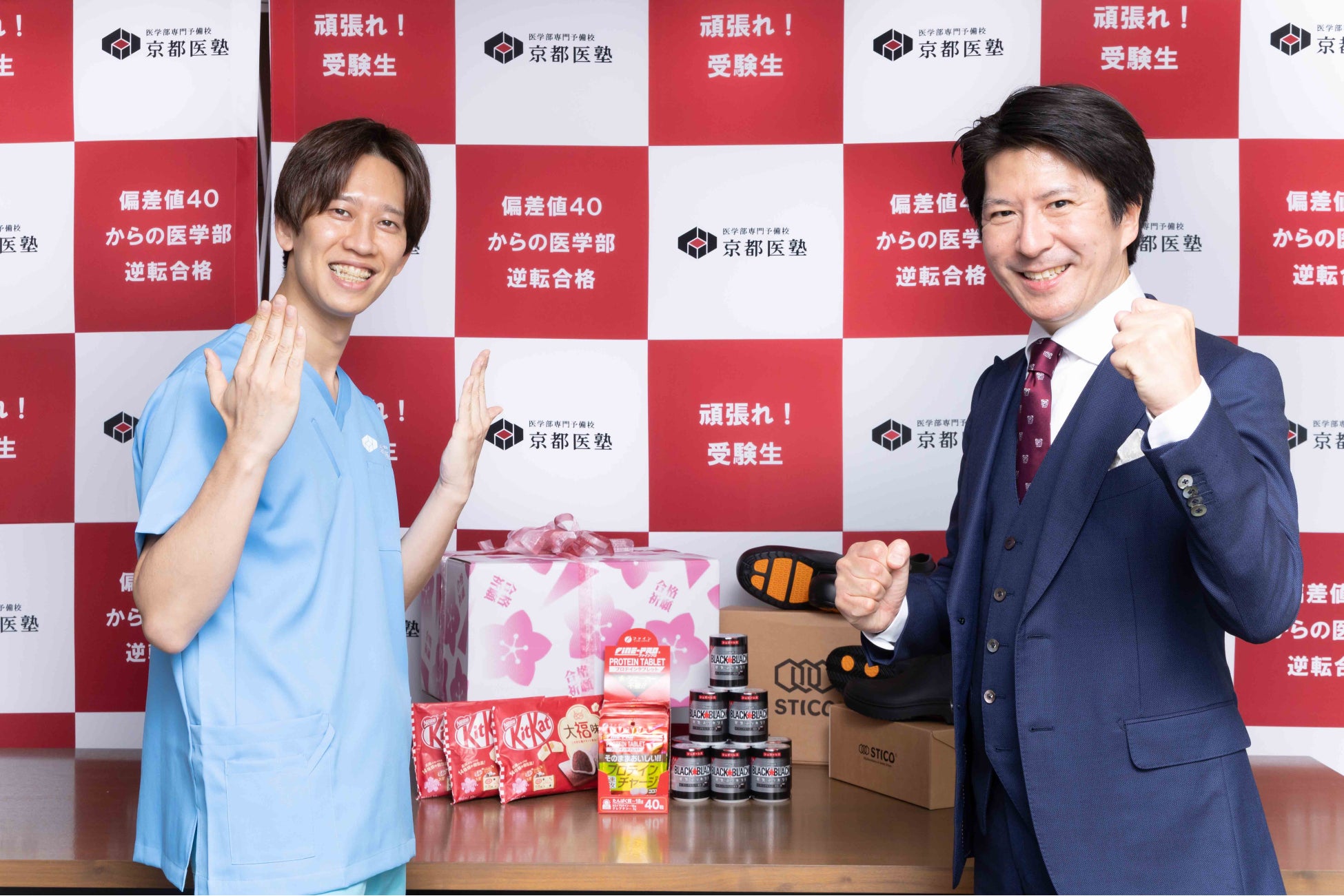 偏差値40からの医学部専門予備校、京都医塾株式会社(本社:京都市中京区 代表取締役 伊藤 章)は、滑らない靴「STICO」や、受験のお供「キットカット」、眠気スッキリ「ブラックブラックガム」、健康をサポートする「ファインプロ®プロテインチャージ」とタッグを組み、『合格祈願応援キット』をプレゼントする共同企画を実施します。また企画の実施を記念し、医師とお笑いタレントの両軸で活躍するしゅんしゅんクリニックPさんが京都医塾を訪問し、年末の追い込みシーズンを控える学生に向けた『合格祈願応援キット』贈呈式を12月13日(火)に実施しました。