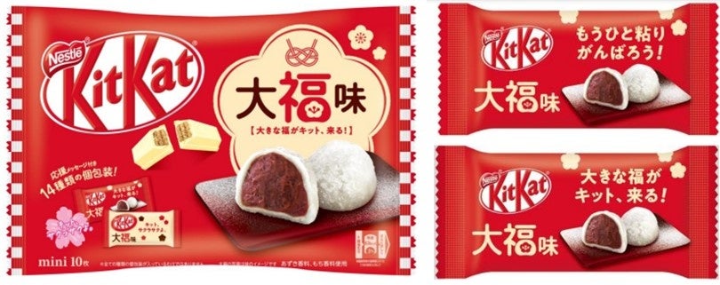 おもちのように粘って、伸びてほしい!」と受験生応援の気持ちを込め、“もち感”のある大福味に仕上げました。おもちフレーバーと小豆フレーバー入りのホワイトチョコでくるんだウェハースにあんこパウダー入りクリームを挟んだ優しいあんこ味です。また、大福味=“大きな福がキット、来る!”という意味合いも込めています。