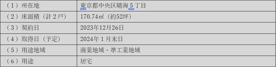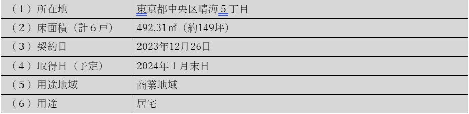 取得相手先名(売主)と取得金額及び取引内容の詳細等につきましては、取得相手先の意向により公表を控えさせていただきます。なお、当社と売主との間には、資本関係、人的関係、取引関係および関連当事者として特記すべき事項はございません。