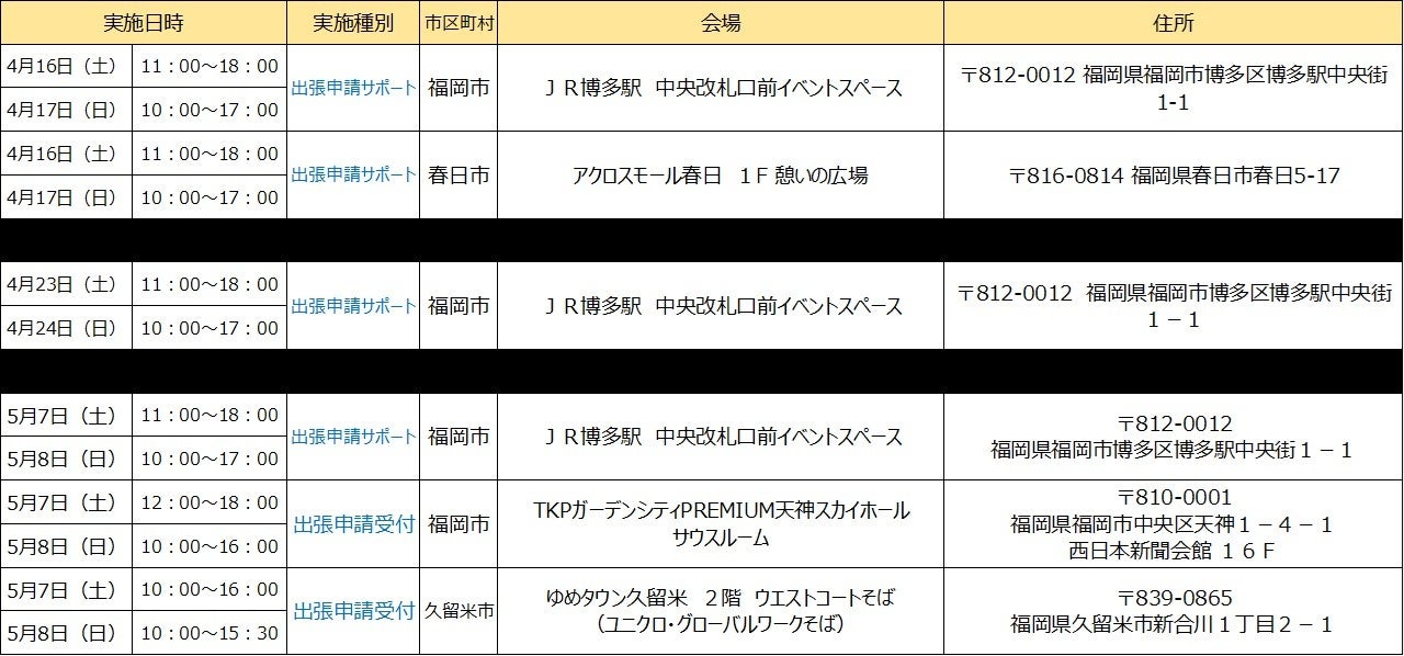 ※開催場所の調整状況や新型コロナウィルスの感染状況等により、「出張申請受付」及び「出張申請サポート」の開催を中止・延期、または実施内容が変更となる可能性がございます。