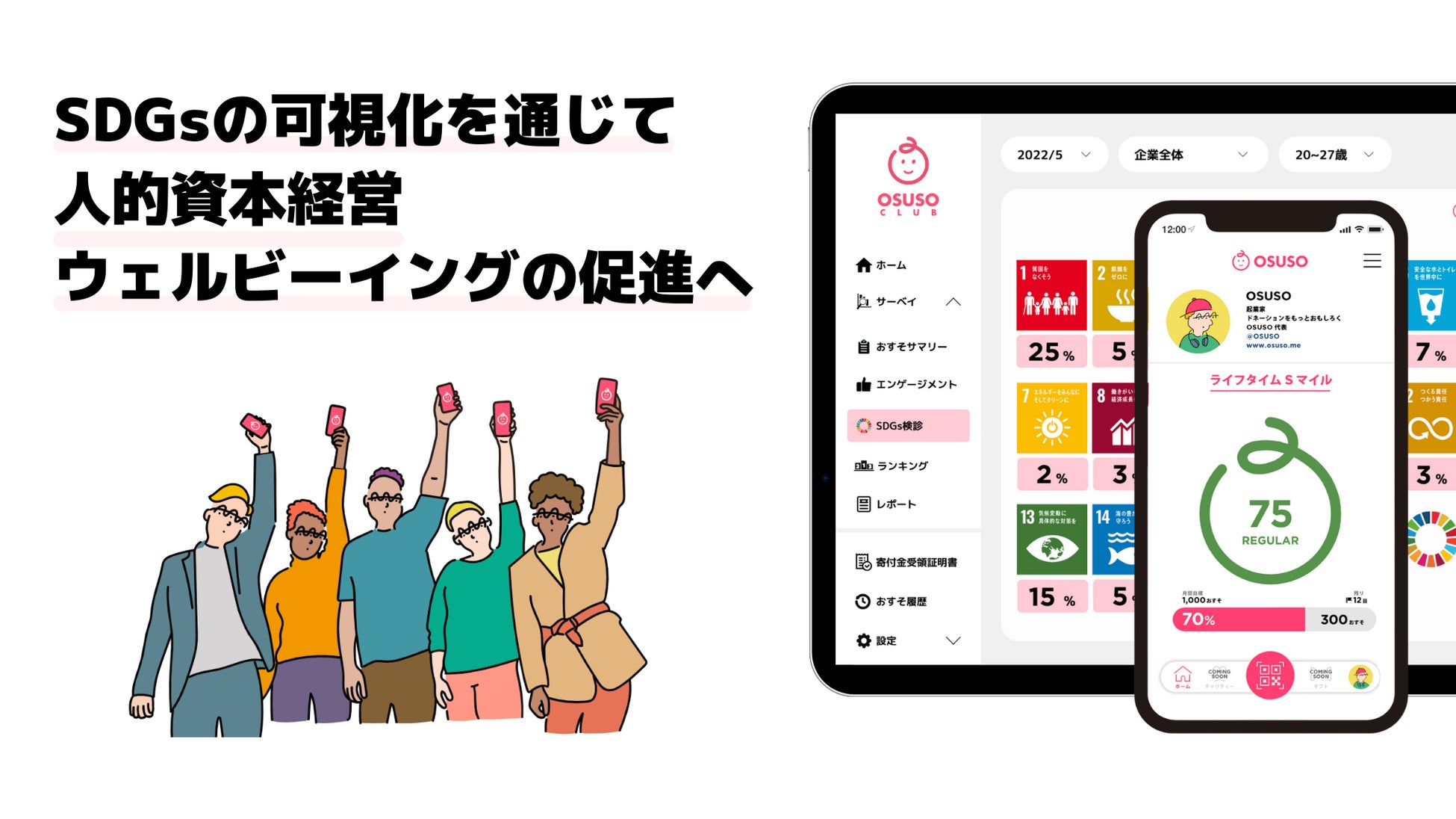 社会貢献アプリ「OSUSO」は、企業向けSXサービス「OSUSO CLUB」と連携することで、従業員の社会貢献活動の結果を定量的に可視化し、ダッシュボードを通じて、企業の管理者が閲覧、管理できるようになります。その結果、企業の社会的価値向上とSDGs達成への貢献を促進します。さらに、従業員のSDGs教育と企業の人的資本価値を高めるための重要な手段として活用いただけます。