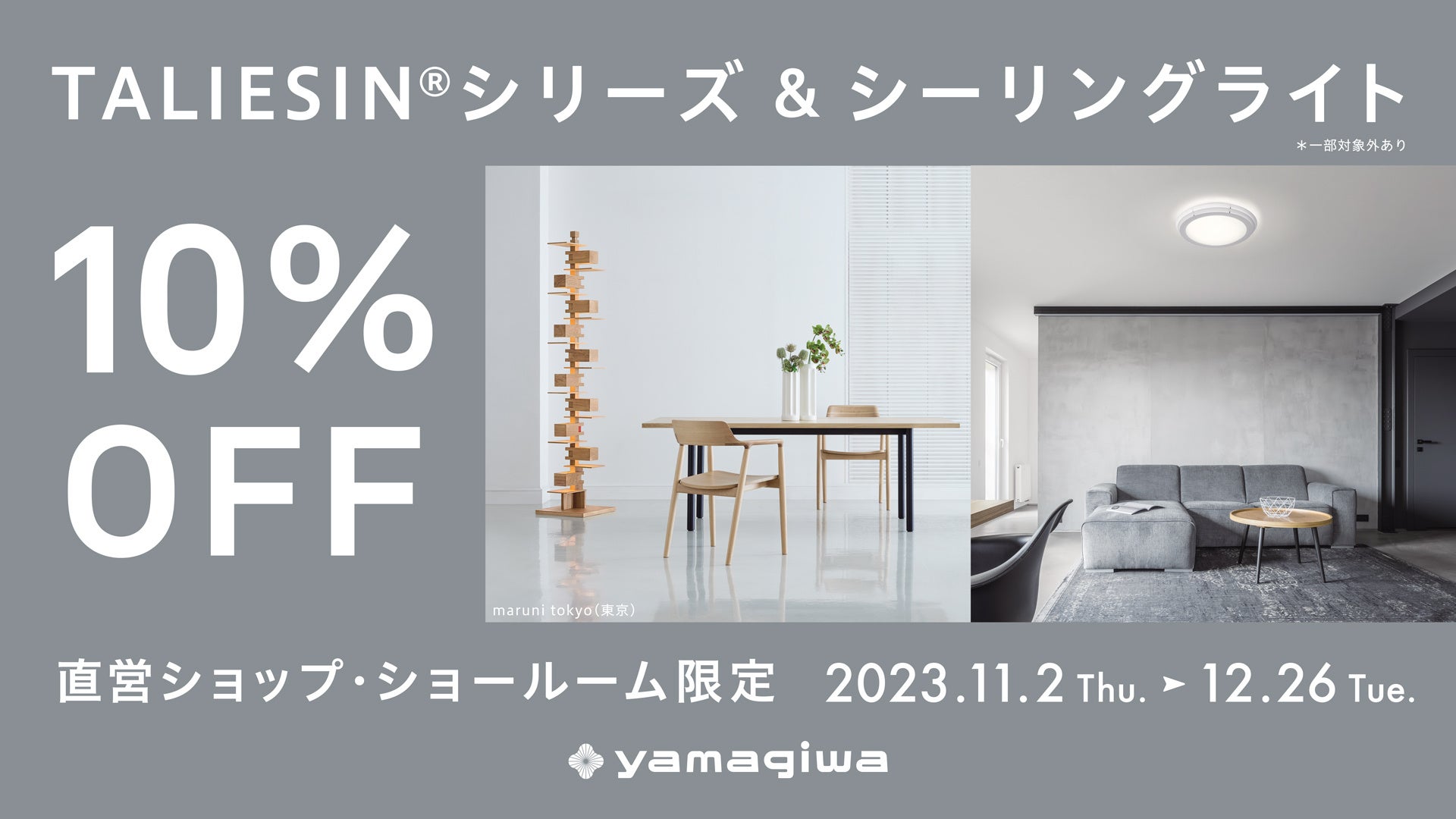 YAMAGIWA直営ショップ・ショールームでは、2023年11月2日から12月26日まで、TALIESIN®シリーズとシーリングライトを対象に商品本体価格より10%割引でお求めいただけるキャンペーンを実施いたします。