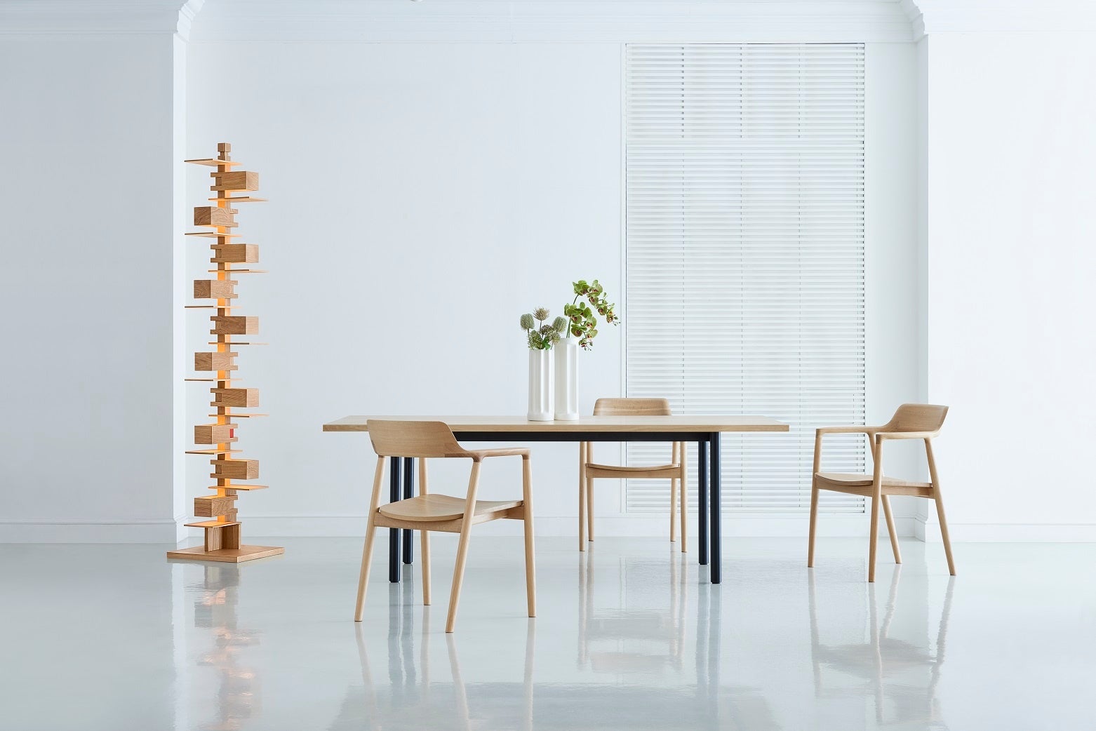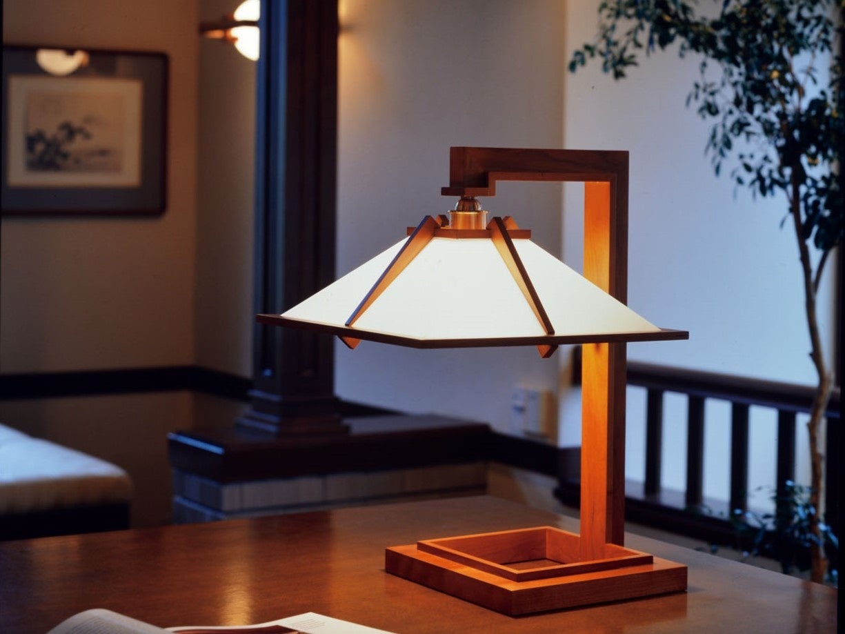 タリアセンは、近代建築の三大巨匠のひとり Frank Lloyd Wright(フランク・ロイド・ライト)が設計した照明器具の復刻シリーズです。本シリーズは、ランプを覆ういくつものブロックで制御された上下方向の光がさらに遮光板に反射し、間接光の心地よい明るさが得られます。消灯時においても抽象彫刻のようなフォルムは、空間に圧倒的な存在感を放ちます。