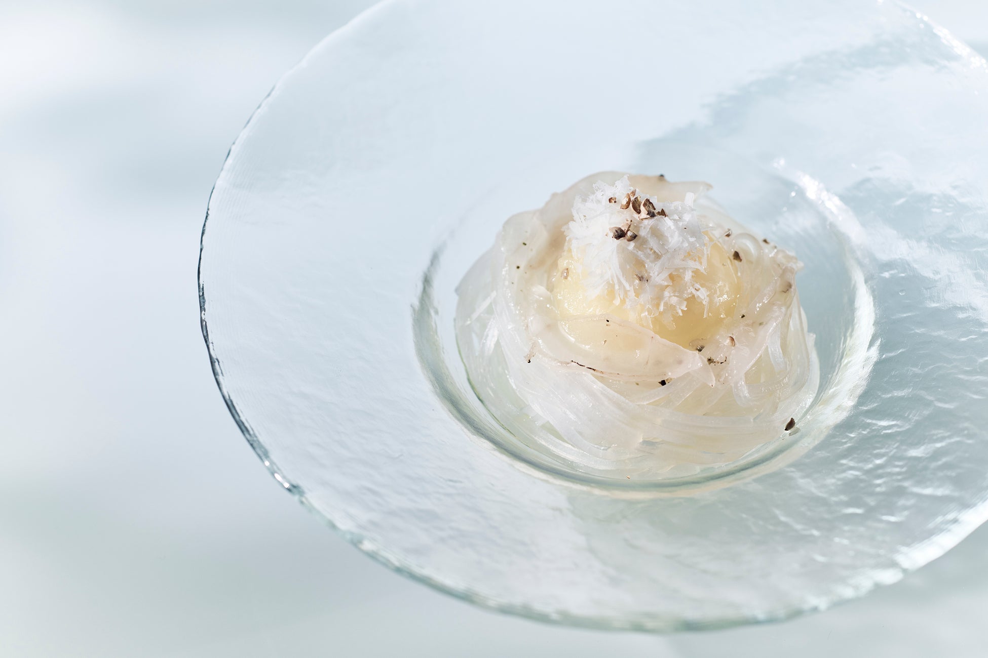 厳しい暑さが続くこの夏、涼しげな透明な食べ物で少しでも“涼”を感じてもらいたいのと、本来は色がある食べ物を「透明料理」に仕立て、見た目の美しさと、見た目とは違う味に驚きを感じていただけたらという目的で行いました。本来は赤いトマトでつくるカプレーゼや黄色のとうもろこしスープを透明に。カルボナーラも透明の麺と“黄身が白い”卵などで美しくヘルシーに仕上げました。」