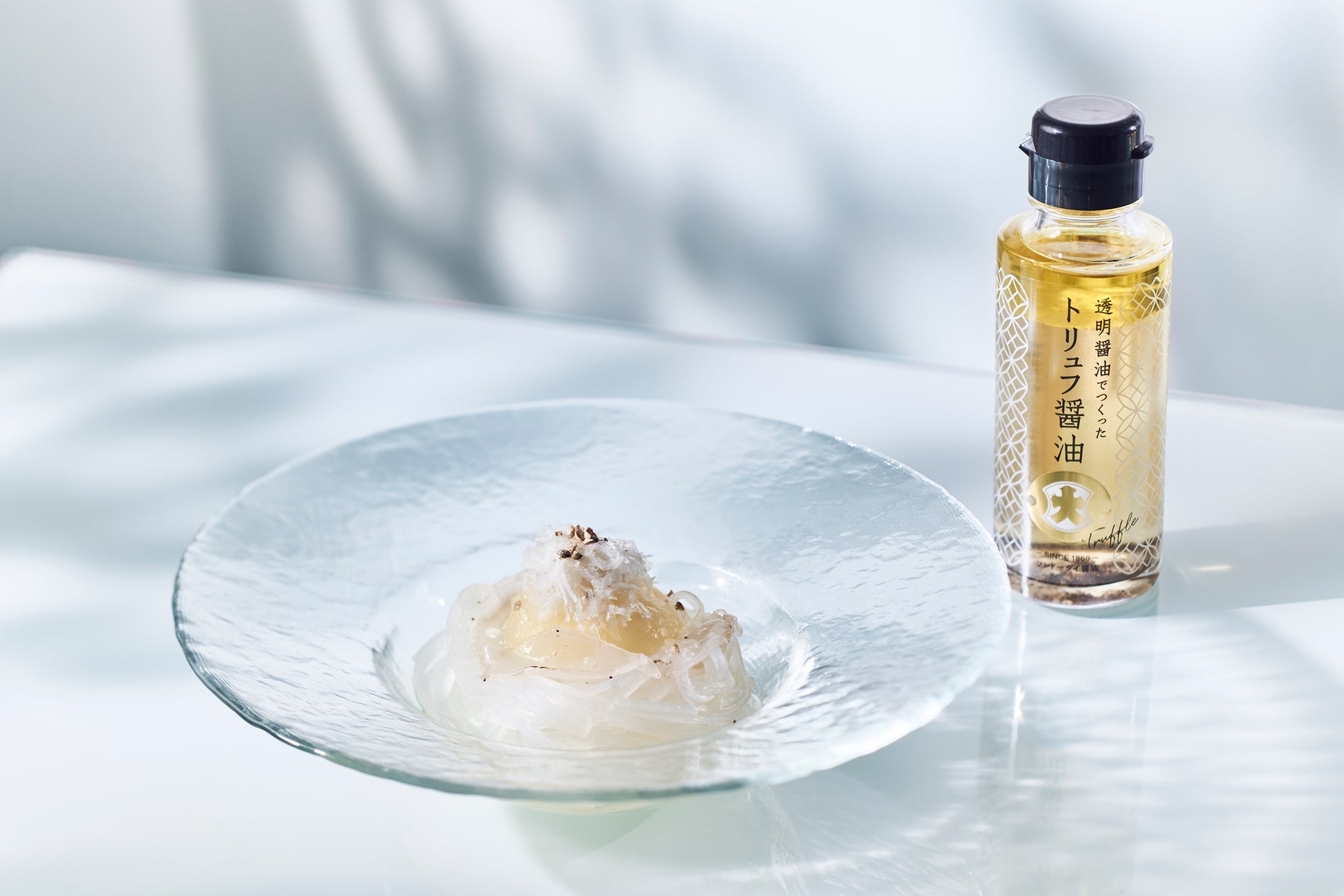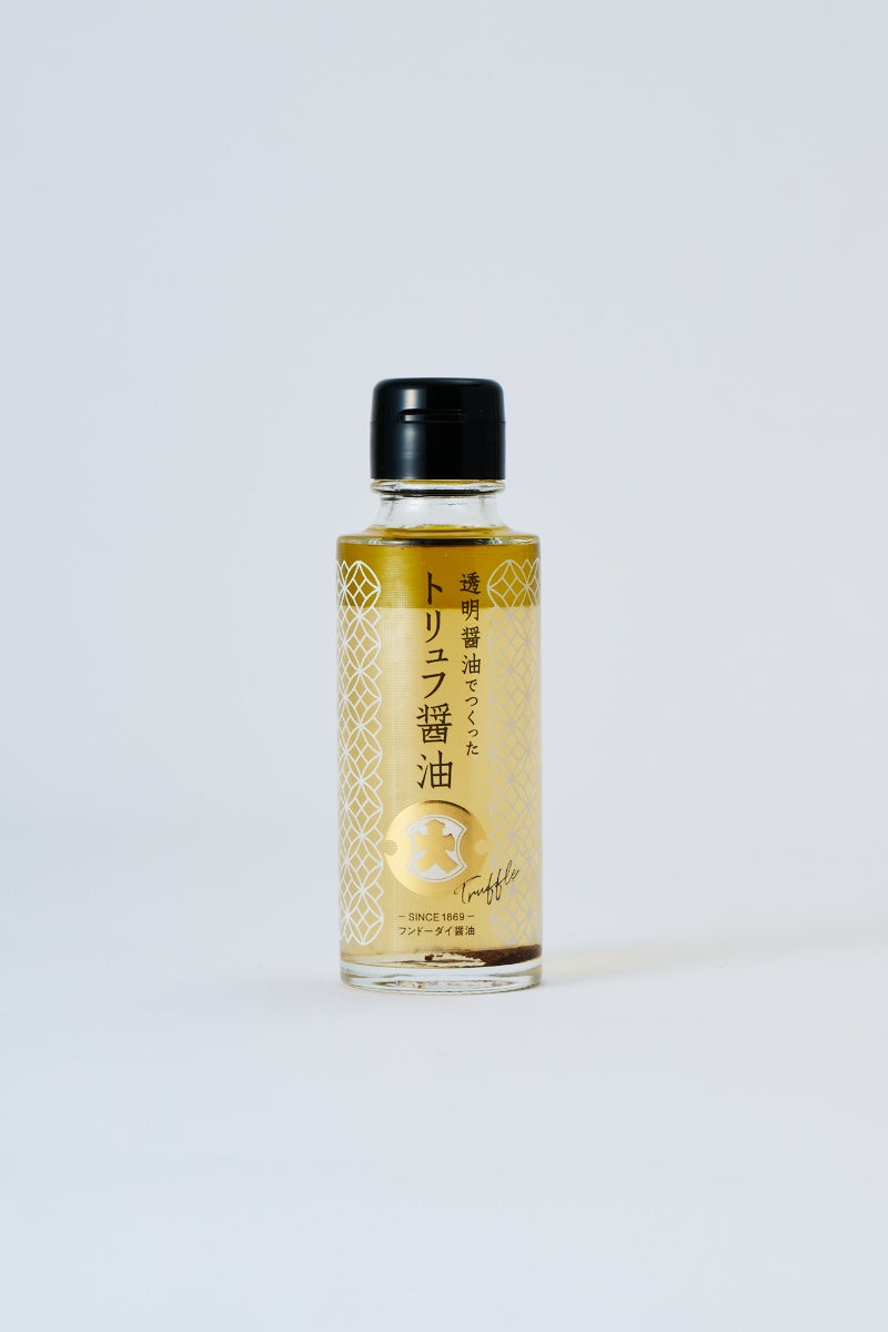 透明醤油をベースに、香り高い白トリュフオイルと黒トリュフの粒を加えた、贅沢な香りが楽しめるお醤油です。