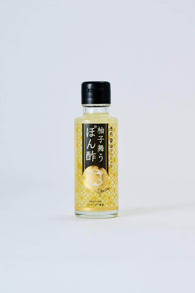 透明醤油でつくった、柚子が主役のぽん酢で、柚子の色が鮮やかです。透明醤油を使うことで、まるで柚子が舞っているかのような黄金色のぽん酢ができました。「黒い」ぽん酢の常識をくつがえす見た目も美しいぽん酢。鍋物・焼き魚はもちろんカルパッチョや冷製パスタなど素材の色を活かしたいお料理におすすめです。