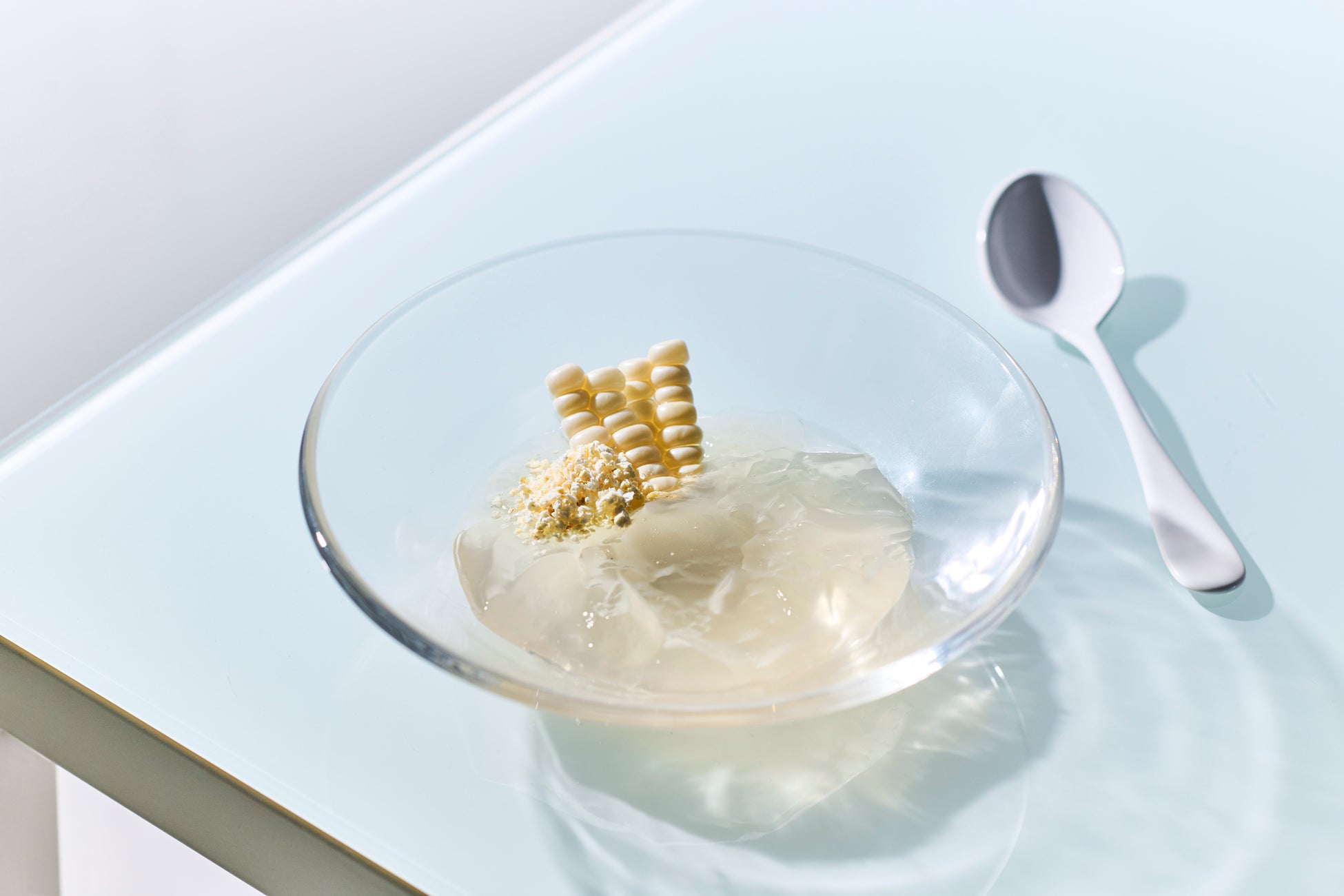 透明なのにしっかりとトマトの味がするカプレーゼや、白とうもろこしを使って透明に仕上げたスープは、お馴染みのコーンスープ の味がします。すぐには理解できない驚きを感じていただけます。