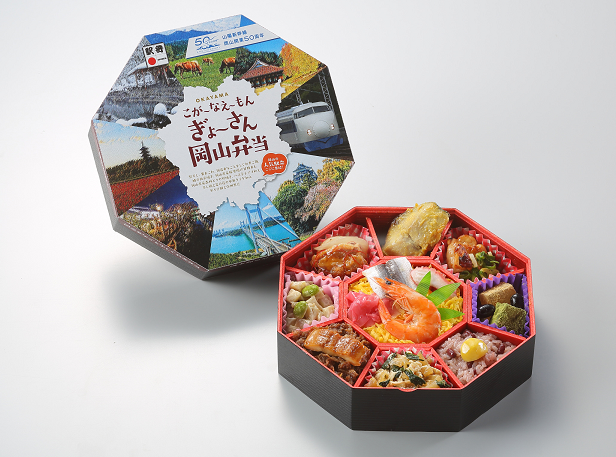 山陽新幹線岡山開業50周年を記念した岡山駅限定駅弁。三好野本店が岡山駅で販売している駅弁の中から、特に人気の8品、それぞれの逸品を集めて盛り込んだスペシャル弁当です。