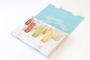 瀬戸内に隣接する県産の7つの果実を集めた色鮮やかなゼリーをパレットに見立てて詰め合わせました。まるで果物を食べているかのような瑞々しい味わいをお楽しみください。1本あたり400mgのコラーゲン入りスティックゼリー。当社の“せとうちパレットプロジェクト”ともコラボした新商品です。
