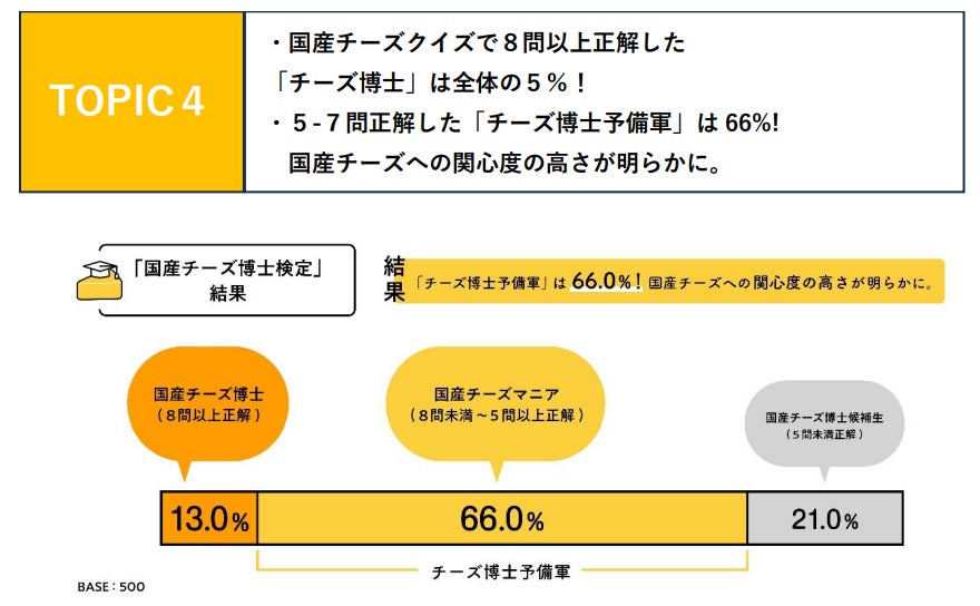 国産チーズに関して実施したクイズでは、10問中8問以上正解した「チーズ博士」は全体の13.0%でした。その一方で、5-7問正解した「チーズ博士予備軍」は66.0%と高数値で、国産チーズへの関心の高まりがうかがえます。